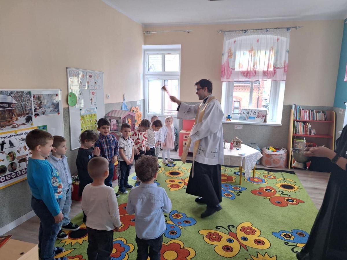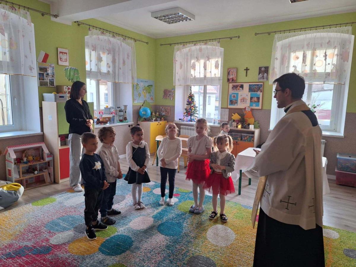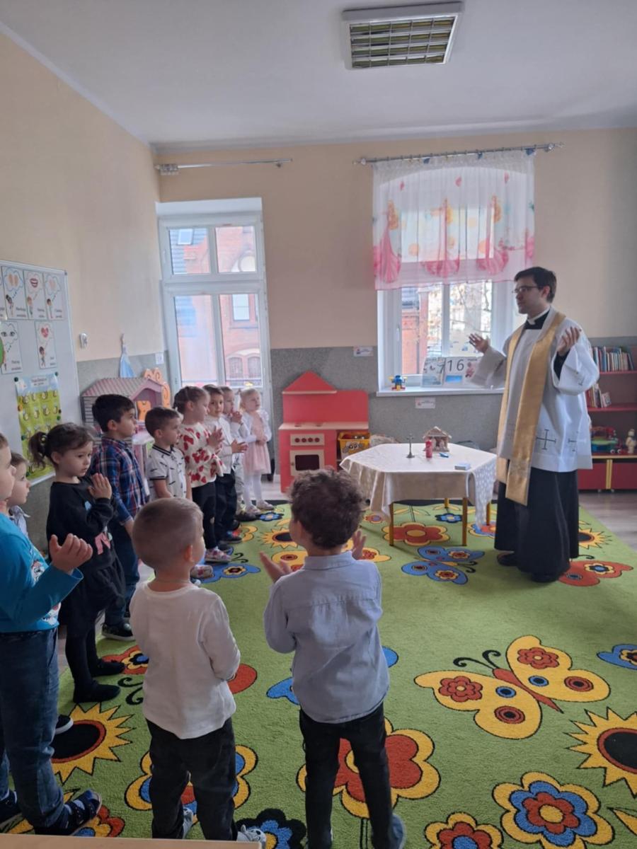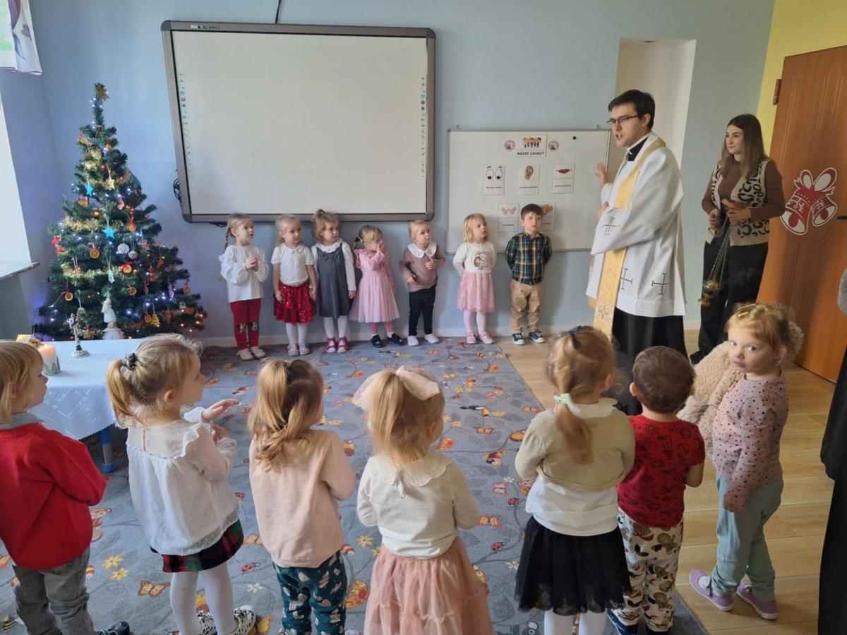 W przedszkolu odbyło się wyjątkowe spotkanie kolędowe, które poprowadził ksiądz Tomasz. W wydarzeniu wzięły udział wszystkie grupy wiekowe – od najmłodszych po najstarsze dzieci. Ksiądz w ciepłych i prostych słowach opowiedział dzieciom o znaczeniu kolędy oraz o narodzinach Pana Jezusa, dostosowując przekaz do wieku przedszkolaków. Dzieci z wielkim zaangażowaniem i radością zaśpiewały kolędę, tworząc świąteczną, pełną spokoju i wzruszenia atmosferę. Spotkanie zakończyło się wspólną modlitwą, podczas której wszyscy obecni dziękowali za miniony czas oraz prosili o dobro i błogosławieństwo. Było to piękne i wartościowe wydarzenie, które sprzyjało budowaniu wspólnoty oraz kultywowaniu tradycji bożonarodzeniowych.