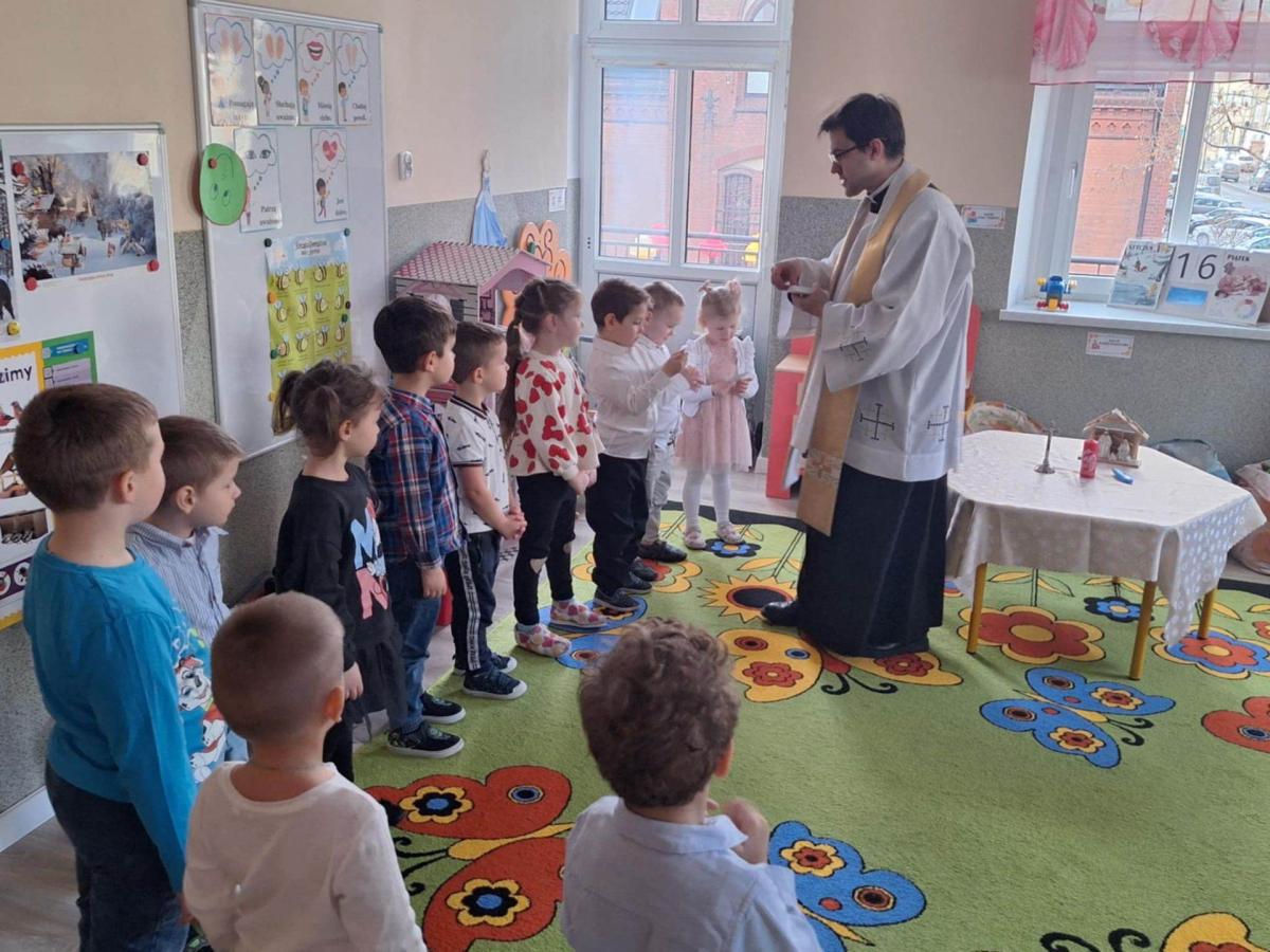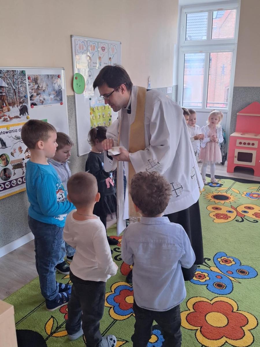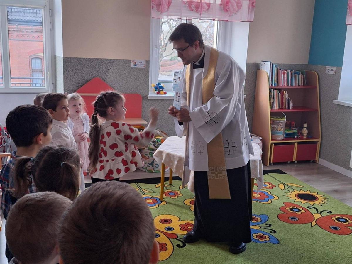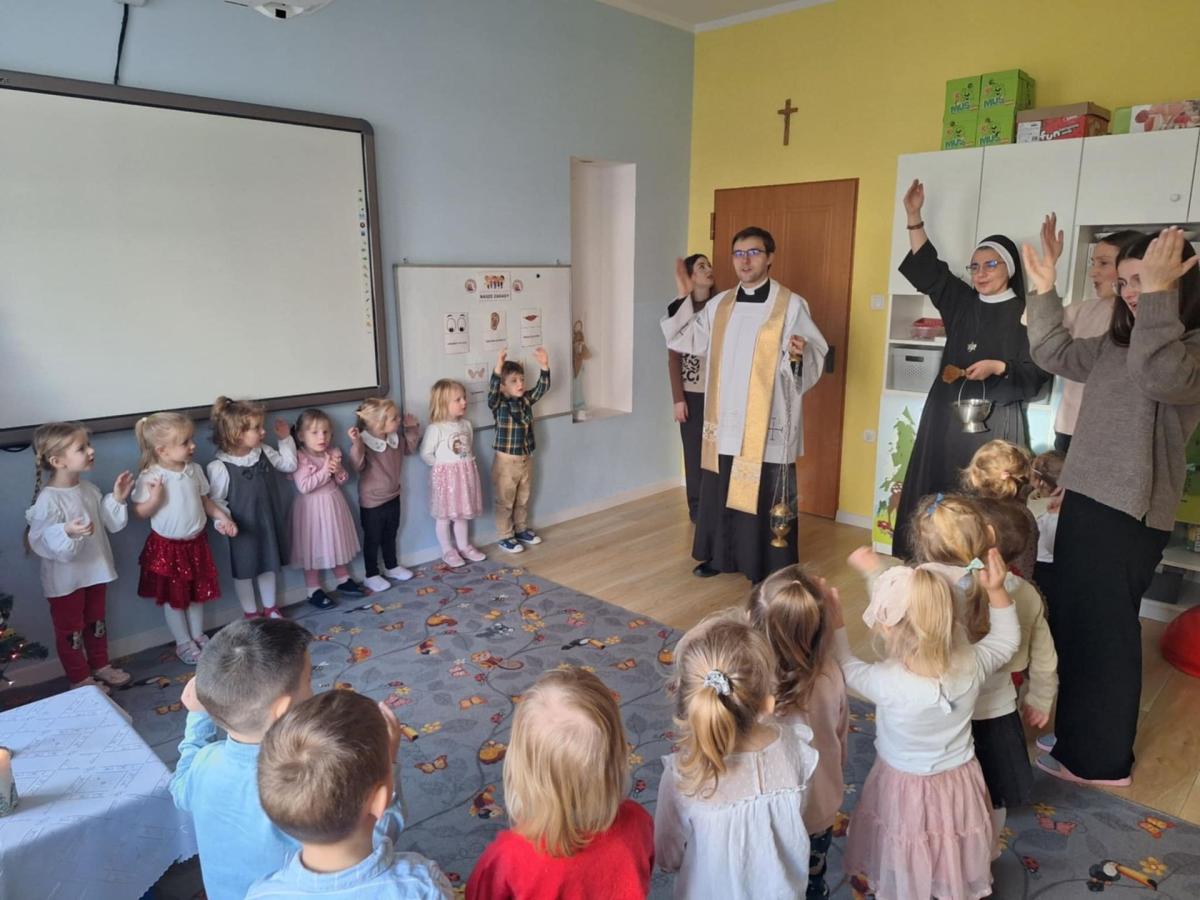 W przedszkolu odbyło się wyjątkowe spotkanie kolędowe, które poprowadził ksiądz Tomasz. W wydarzeniu wzięły udział wszystkie grupy wiekowe – od najmłodszych po najstarsze dzieci. Ksiądz w ciepłych i prostych słowach opowiedział dzieciom o znaczeniu kolędy oraz o narodzinach Pana Jezusa, dostosowując przekaz do wieku przedszkolaków. Dzieci z wielkim zaangażowaniem i radością zaśpiewały kolędę, tworząc świąteczną, pełną spokoju i wzruszenia atmosferę. Spotkanie zakończyło się wspólną modlitwą, podczas której wszyscy obecni dziękowali za miniony czas oraz prosili o dobro i błogosławieństwo. Było to piękne i wartościowe wydarzenie, które sprzyjało budowaniu wspólnoty oraz kultywowaniu tradycji bożonarodzeniowych.