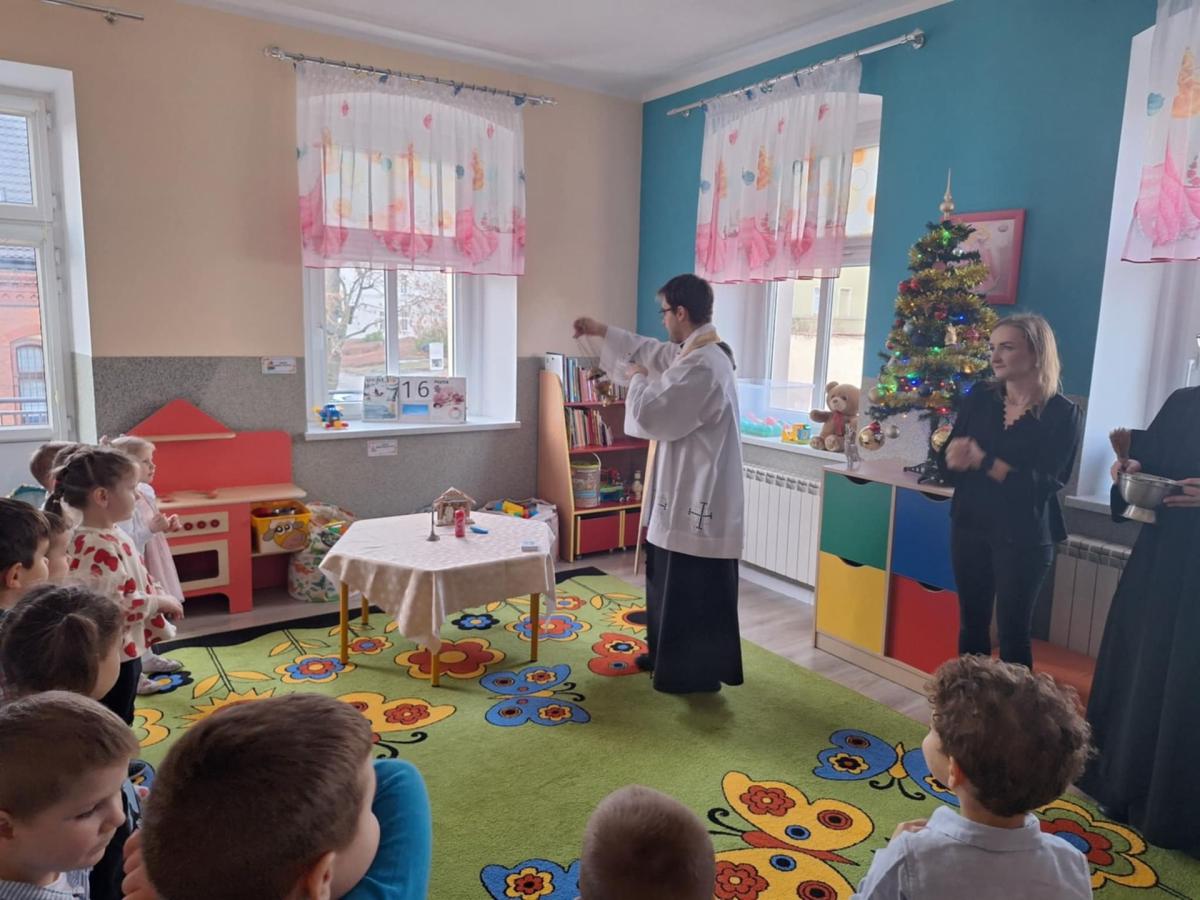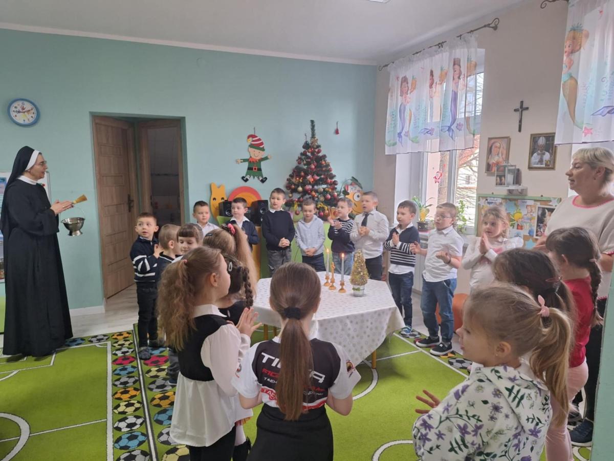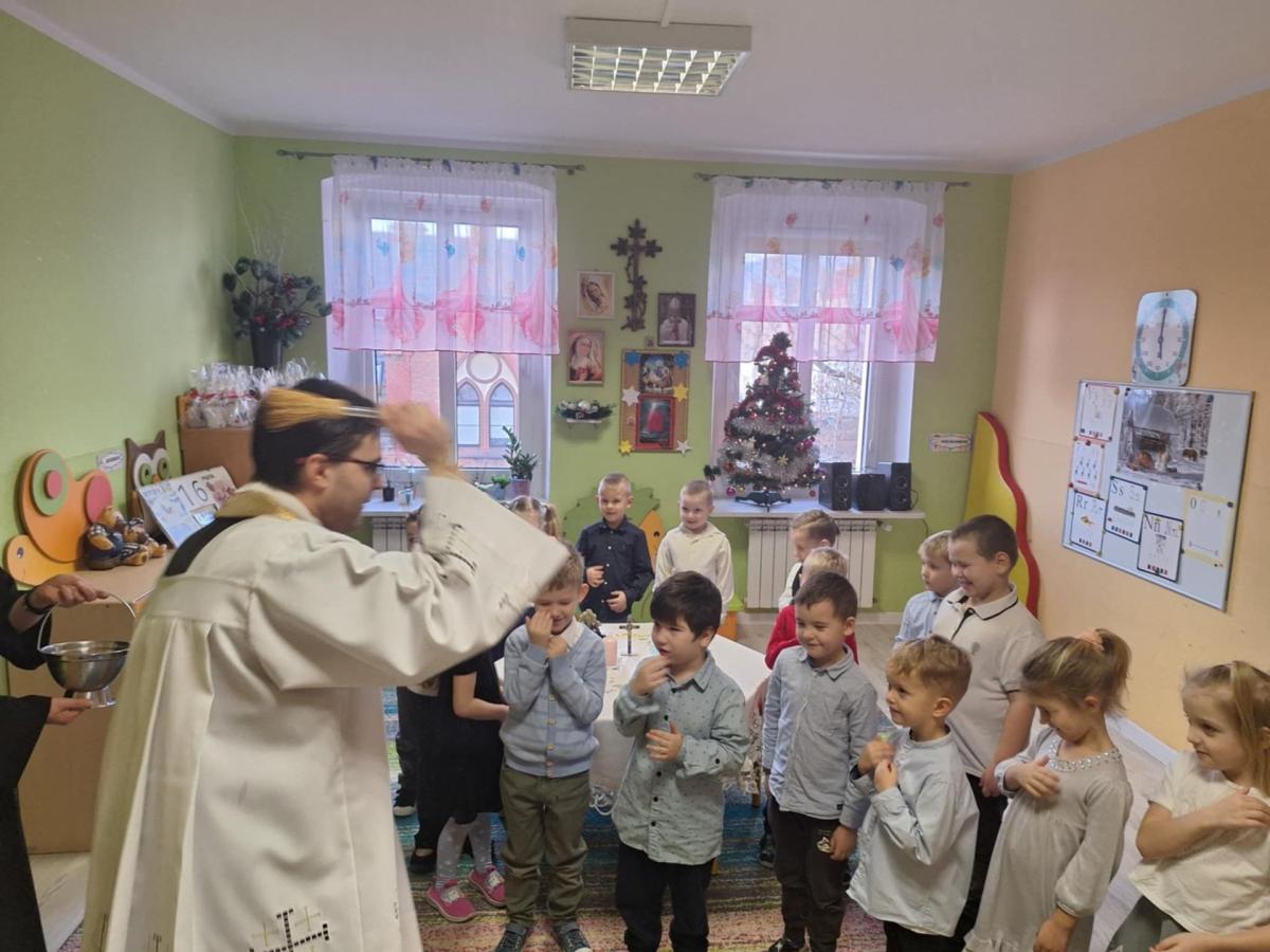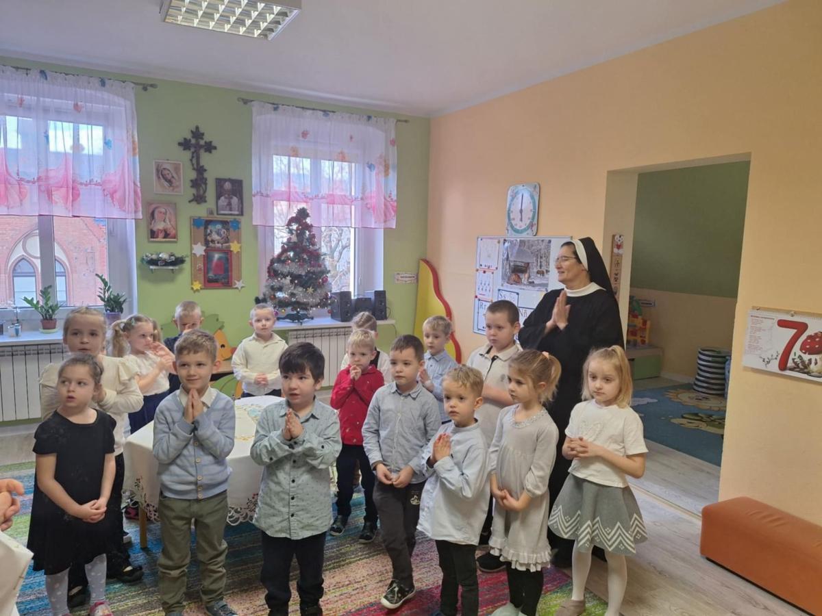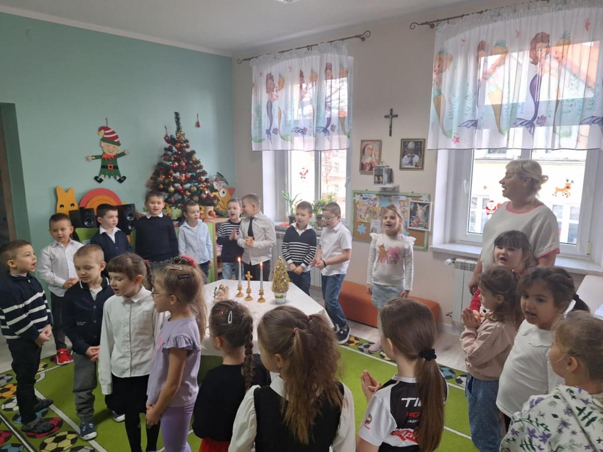 W przedszkolu odbyła się uroczysta wigilia z udziałem dzieci i nauczycieli. Sala była pięknie udekorowana, a w tle śpiew kolęd. Dzieci, ubrane w odświętne stroje, składały sobie życzenia i dzieliły się opłatkiem, ucząc się w ten sposób tradycji oraz okazywania życzliwości i szacunku innym. Następnie wszyscy zasiedli do wspólnego, świątecznego poczęstunku. Spotkanie przebiegało w radosnej i ciepłej atmosferze, pełnej uśmiechu, integracji i świątecznego nastroju.