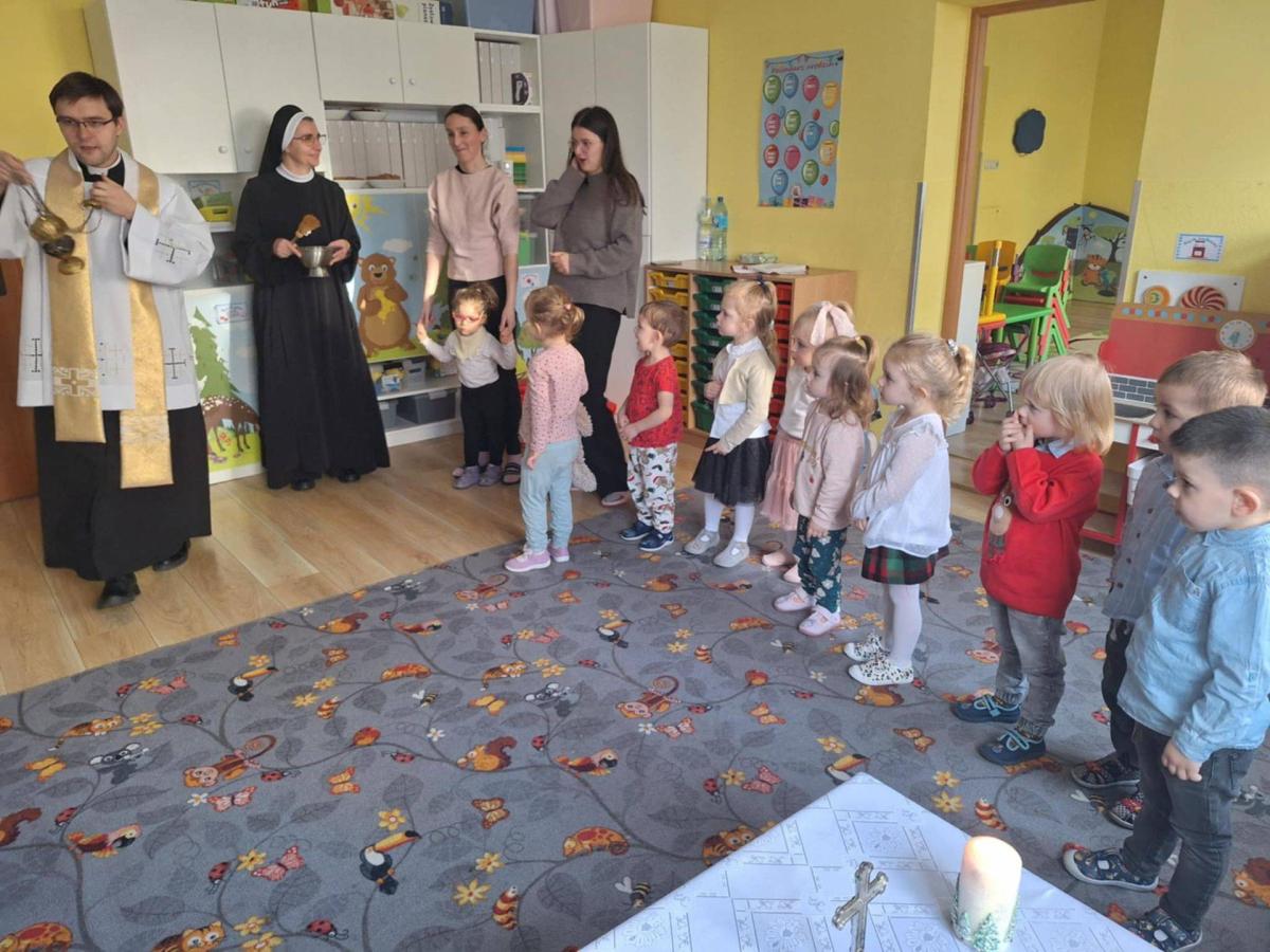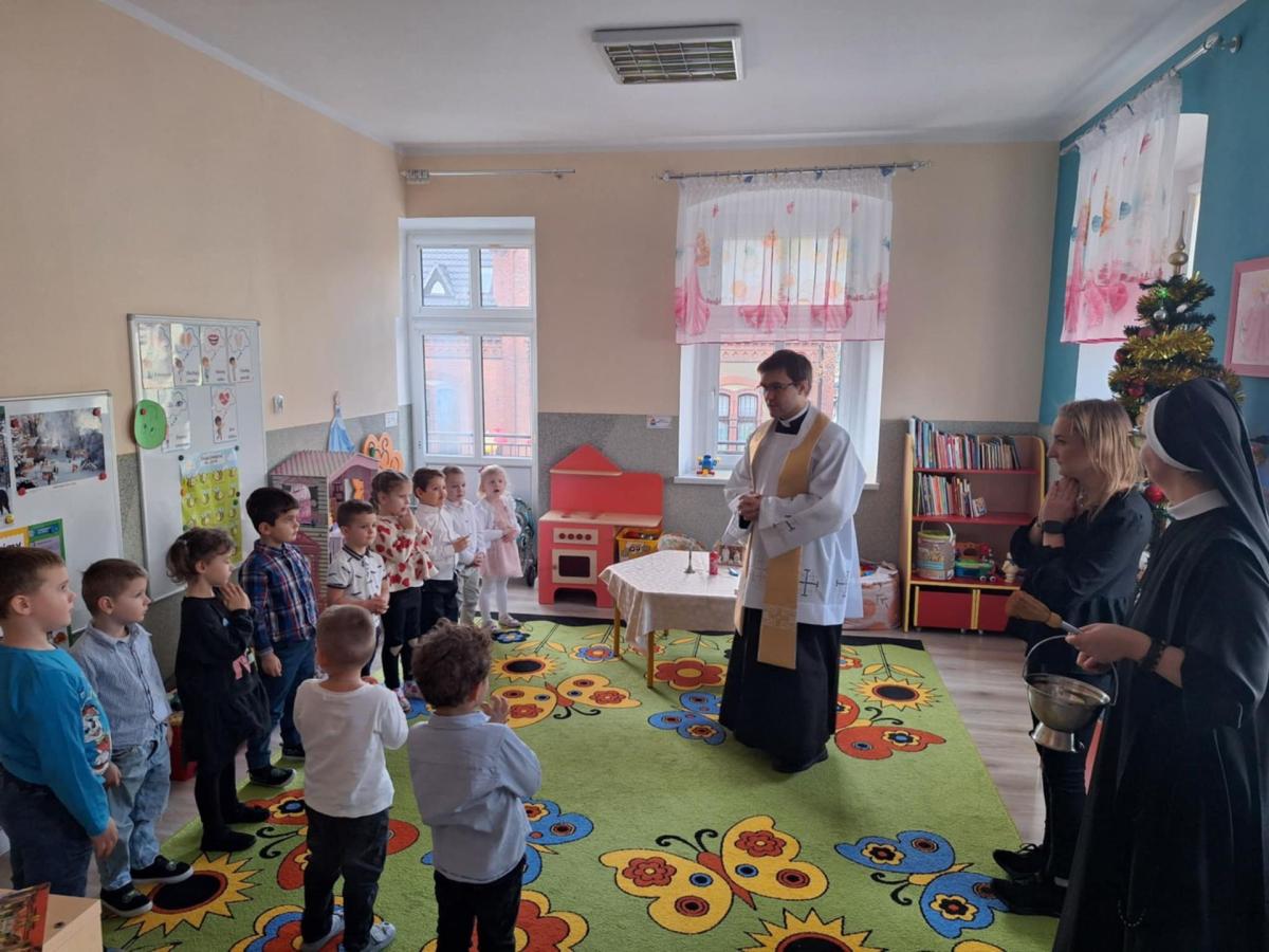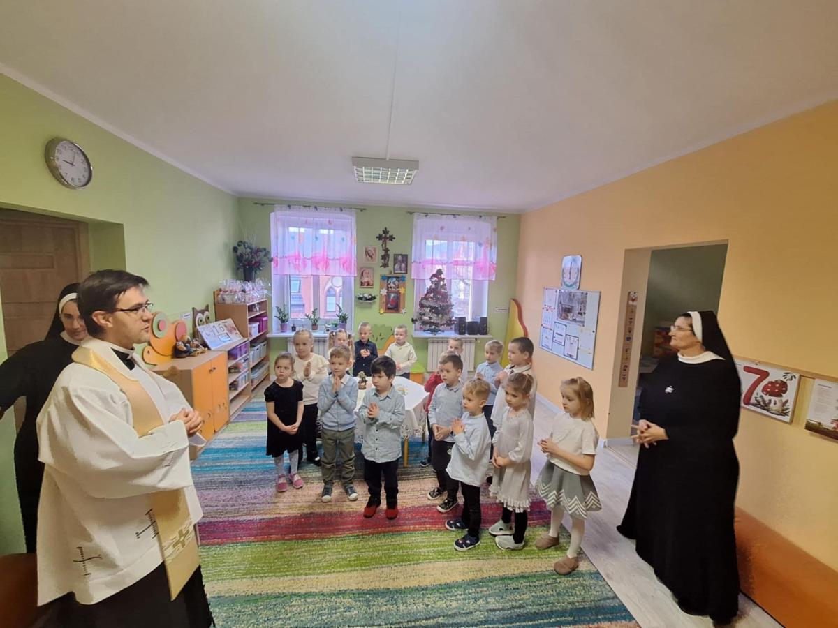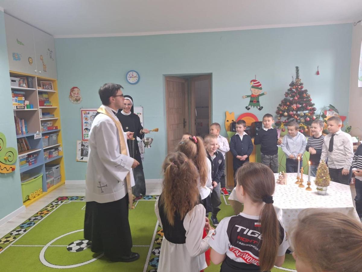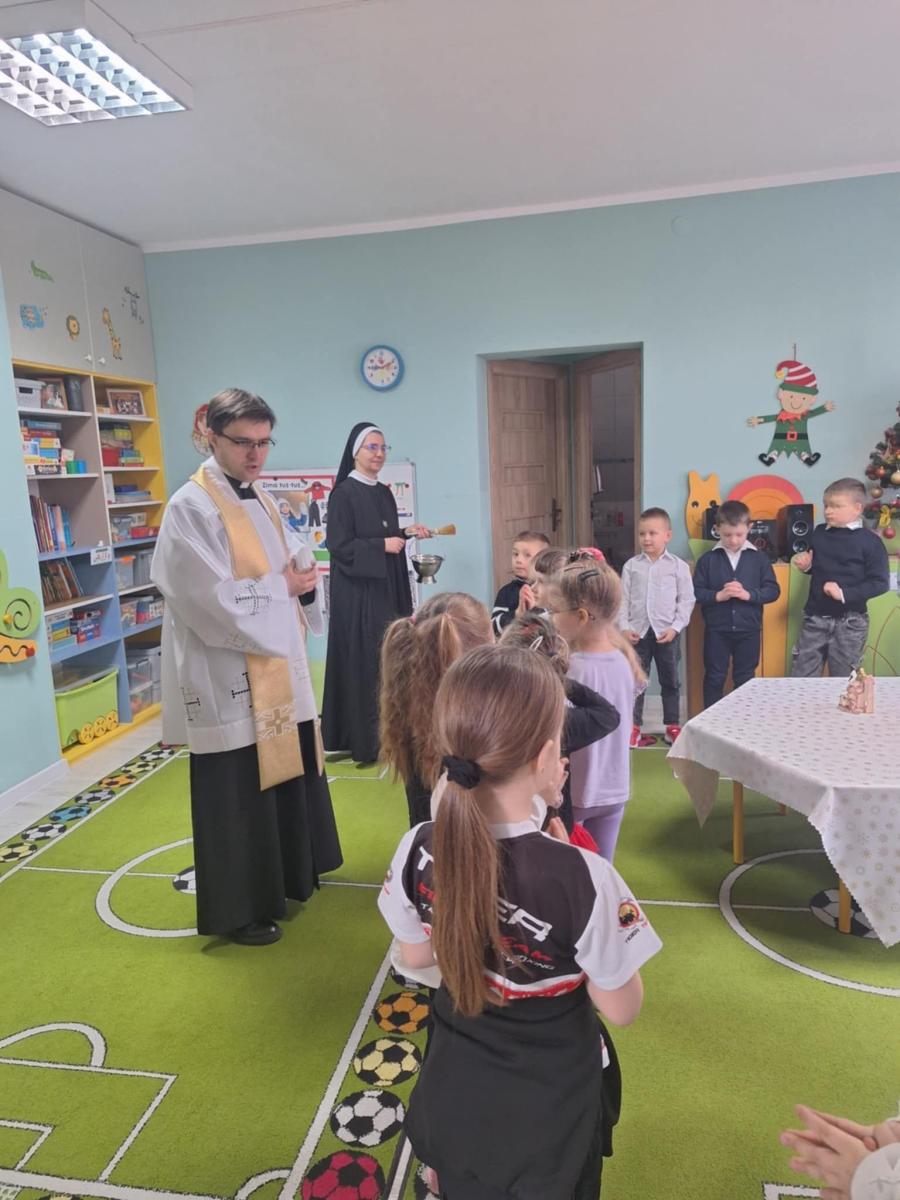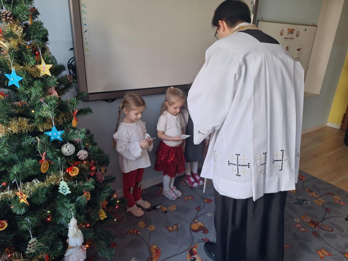 W przedszkolu odbyła się uroczysta wigilia z udziałem dzieci i nauczycieli. Sala była pięknie udekorowana, a w tle śpiew kolęd. Dzieci, ubrane w odświętne stroje, składały sobie życzenia i dzieliły się opłatkiem, ucząc się w ten sposób tradycji oraz okazywania życzliwości i szacunku innym. Następnie wszyscy zasiedli do wspólnego, świątecznego poczęstunku. Spotkanie przebiegało w radosnej i ciepłej atmosferze, pełnej uśmiechu, integracji i świątecznego nastroju.
