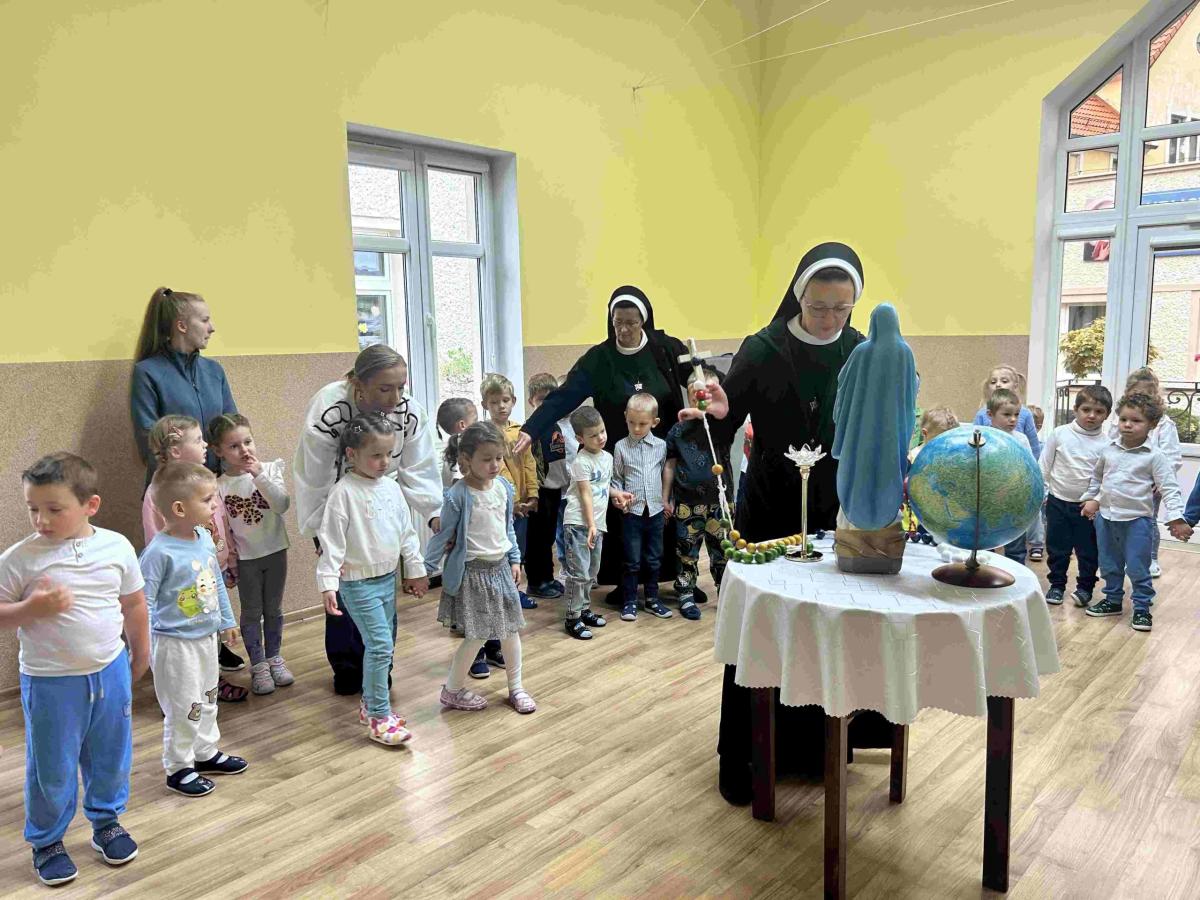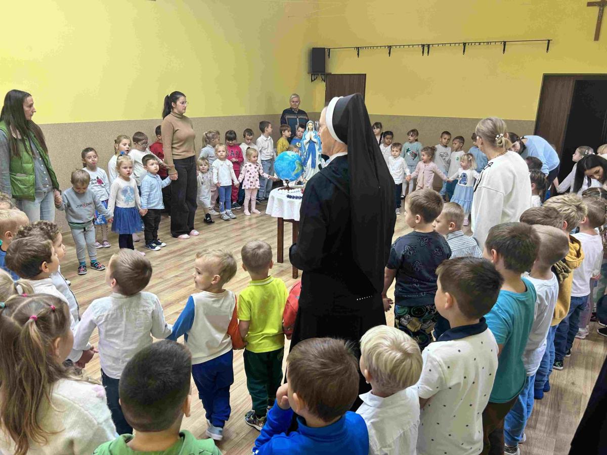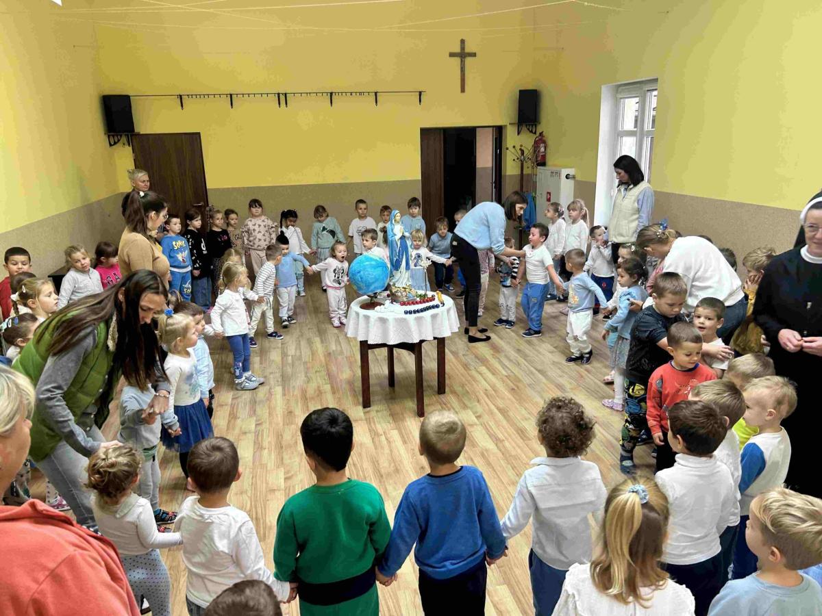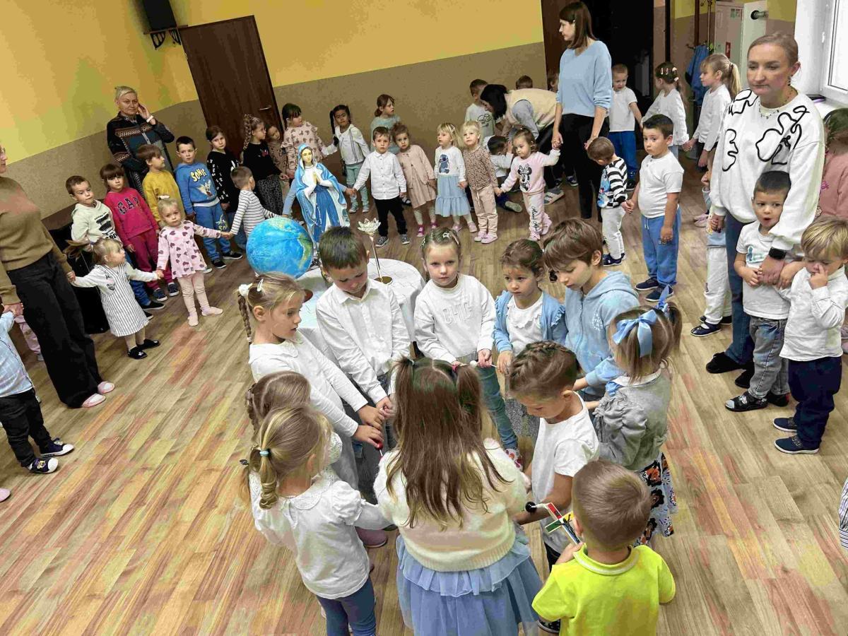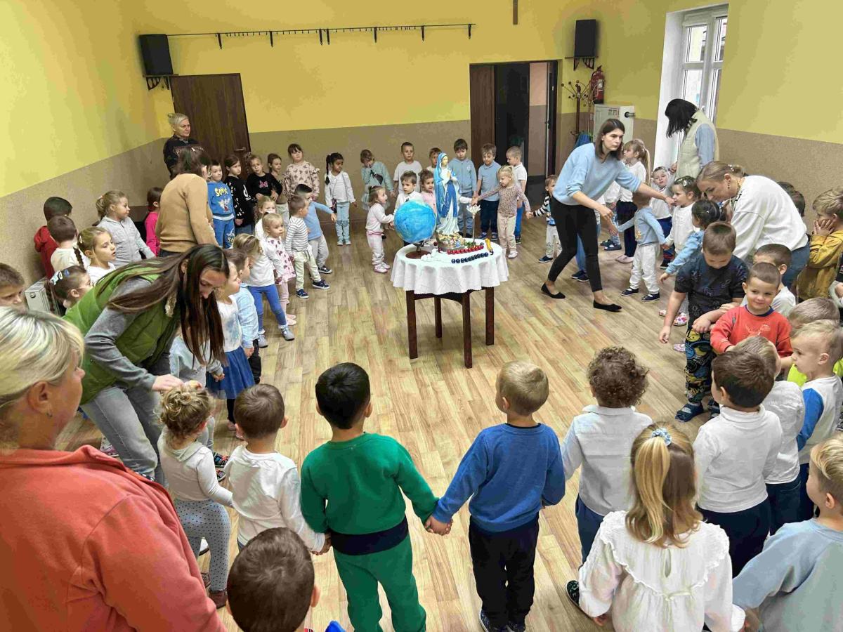 Również i nasze przedszkole przyłączyło się do tej jakże pięknej akcji. 7 października od rana można było zauważyć przychodzące dzieci ubrane na biało - niebiesko. O godz. 10.15, razem z dziećmi zgromadziliśmy się na sali gimnastycznej, by wspólnie odmówić dziesiątek różańca, prosząc o pokój na świecie i w każdym ludzkim sercu. Dzieci z ogromnym zaangażowaniem wołały wspólnie „Zdrowaś Maryjo…” Modlitwa dzieci ma niezwykłą moc, która z pewnością została przyjęta przez Pana Jezusa.
