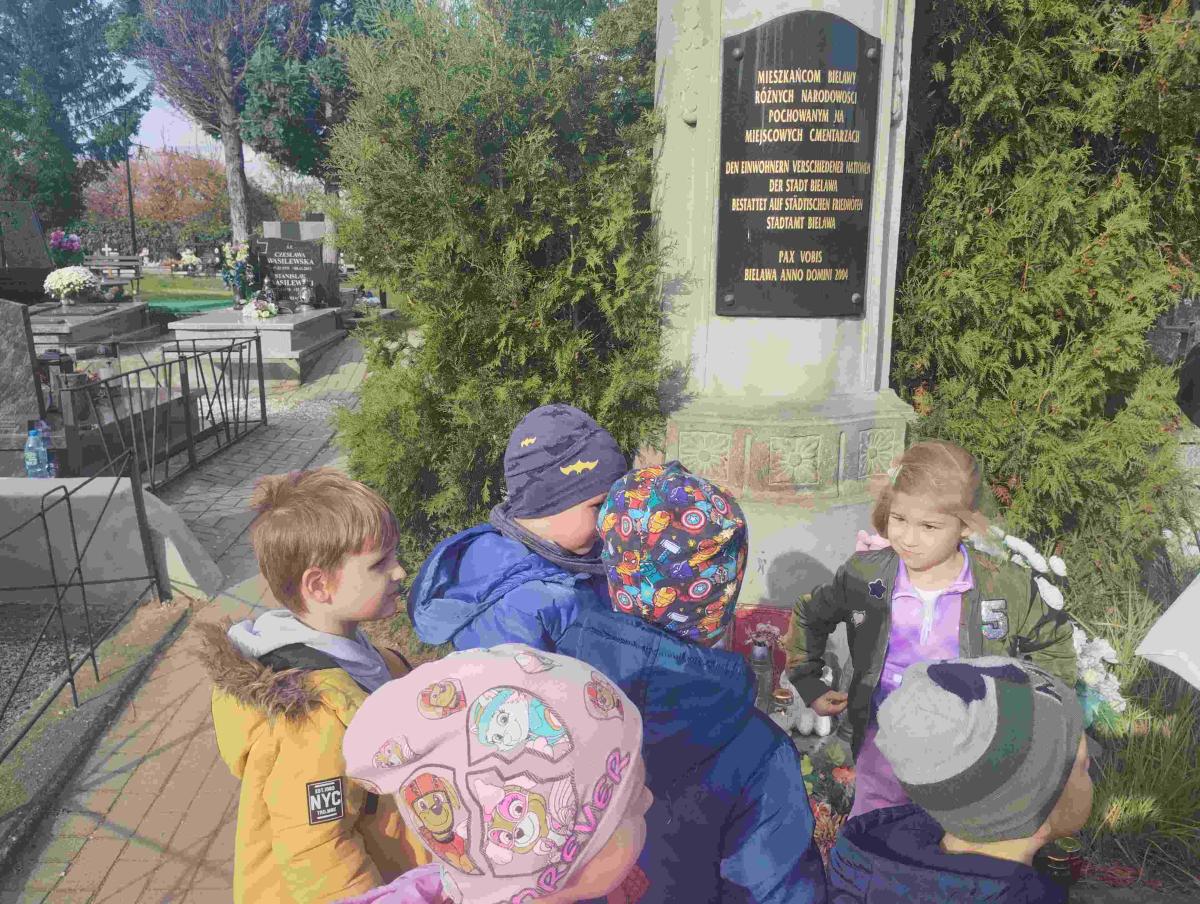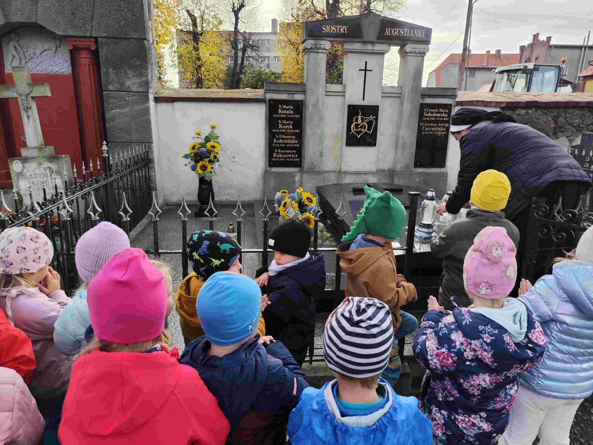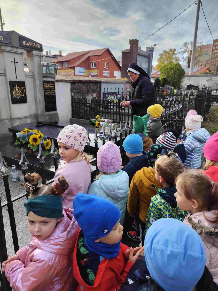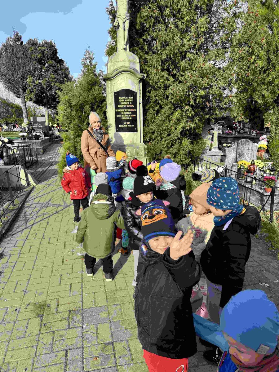 Podczas pobytu na cmentarzu przedszkolaki mogły w ciszy i zadumie zapalić znicze na grobach. Wychowankowie dowiedzieli się także, jak należy zachowywać się na cmentarzu, by nie zakłócać spokoju zmarłych i osób odwiedzających to miejsce. Spacer alejkami cmentarza był dla dzieci ogromnym przeżyciem, szły skupione i bardzo zaciekawione. To była jedna z ważniejszych lekcji wychowania rodzinnego, obywatelskiego i patriotycznego, która z pewnością pozostanie w pamięci dzieci.