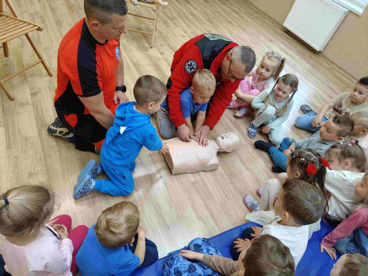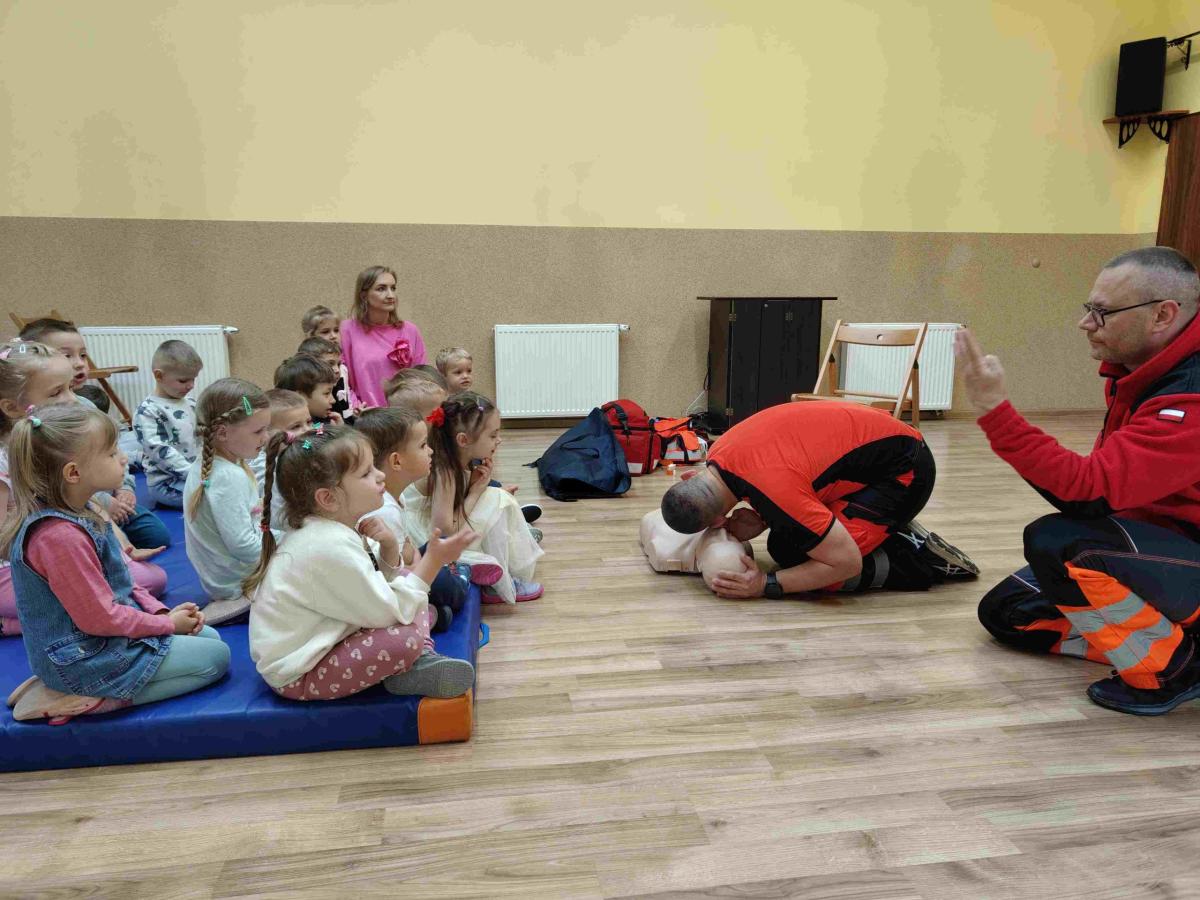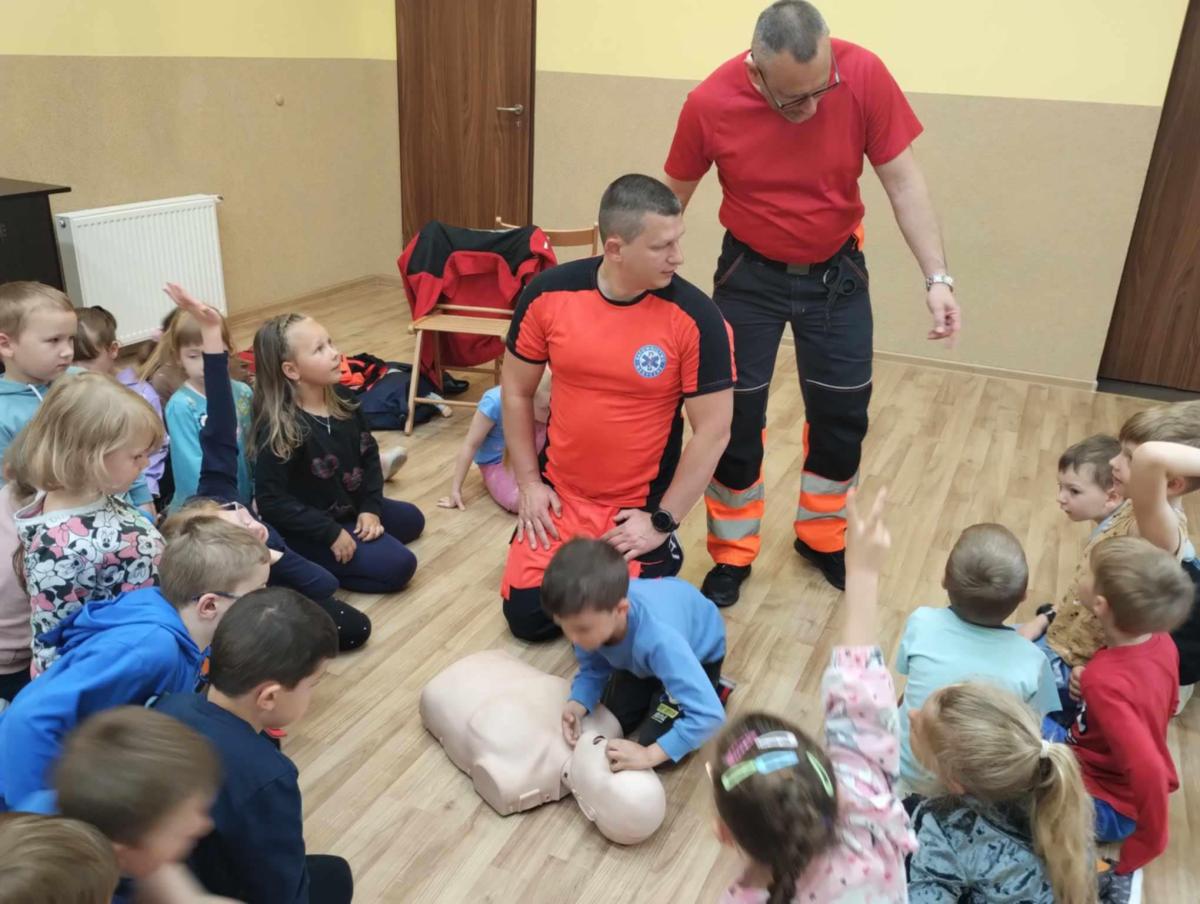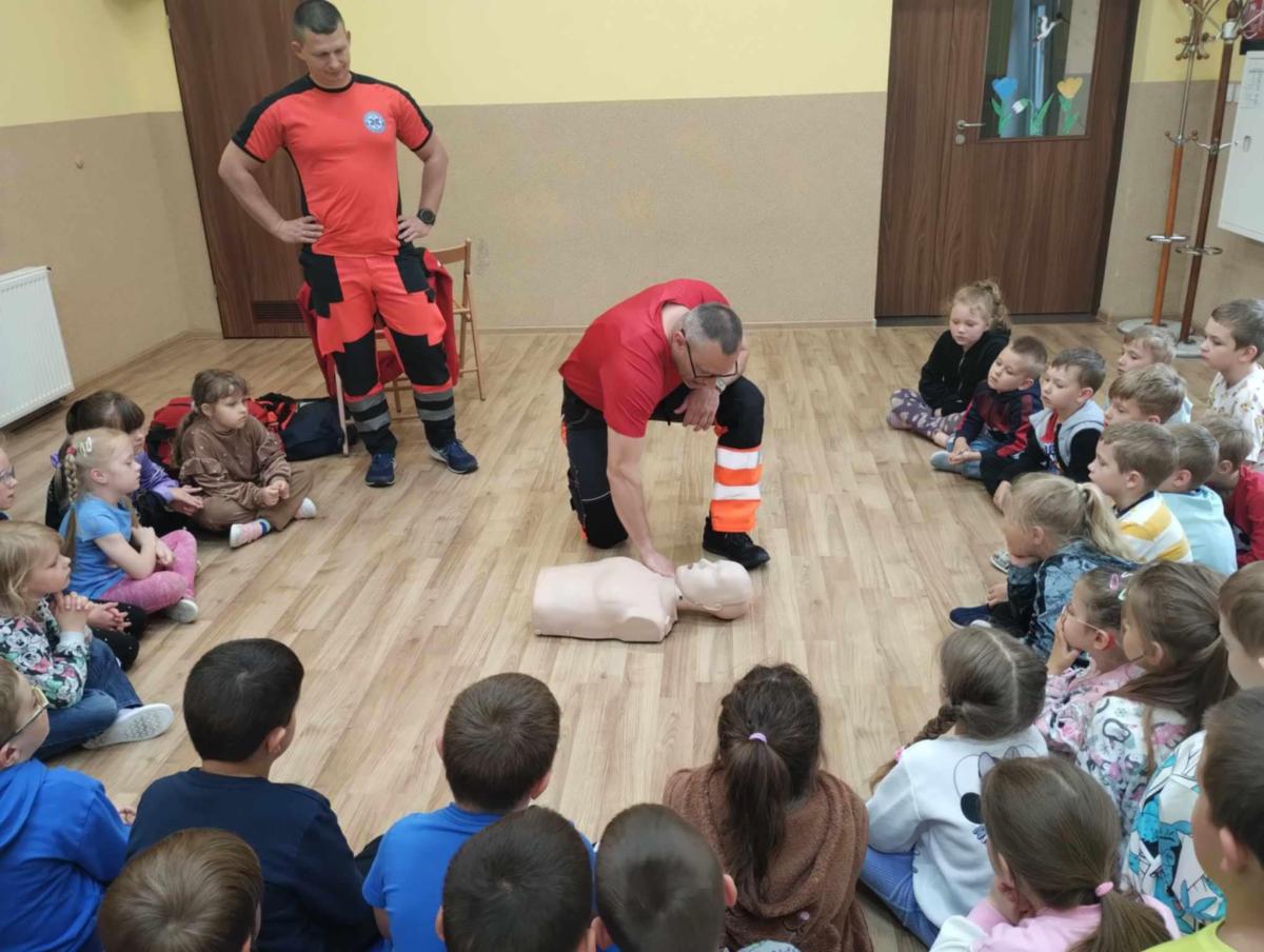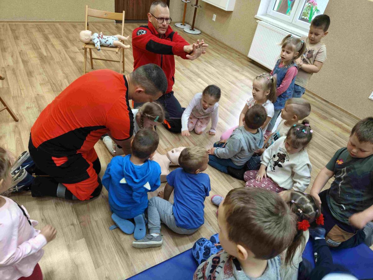 W przedszkolu dzieci uczestniczyły w zajęciach edukacyjnych z zakresu udzielania pierwszej pomocy przedmedycznej, które miały na celu kształtowanie pozytywnych i bezpiecznych postaw oraz zapoznanie najmłodszych z podstawowymi czynnościami ratowniczymi w wypadku nieobecności osób dorosłych. Przedszkolaki dowiedziały się w jaki sposób udziela się pierwszej pomocy, jak pomóc poszkodowanym zanim przyjedzie pogotowie ratunkowe. Dzieci z zainteresowaniem słuchały wskazówek dotyczących zachowania się w sytuacji zagrożenia życia. Nauczyły się podstawowych numerów alarmowych oraz jak wezwać pomoc przez telefon. Przedszkolaki wiedzą do kogo zwracać się gdy czują się zagrożone, same również są świadome konieczności zachowywania się w sposób bezpieczny taki, by apteczka i jej wyposażenie były jak najmniej potrzebne. Zgromadzoną wiedzę będą mogły wykorzystać w przyszłości przychodząc z pomocą koledze lub najbliższym z rodziny. Dzięki praktycznym działaniom nabierają wprawy i przełamują strach, to tu w przedszkolu rodzą się mali bohaterowie. Dziękujemy Ratownikom Medycznym: Panu Witoldowi i Panu Rafałowi prywatnie tatusiom naszych przedszkolaków za dzisiejsze zajęcia i poświęcony nam czas. Bóg zapłać!