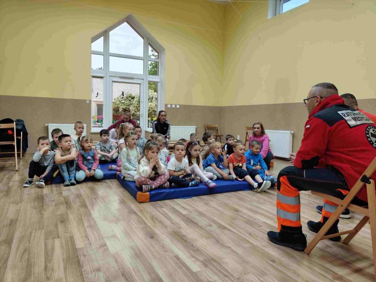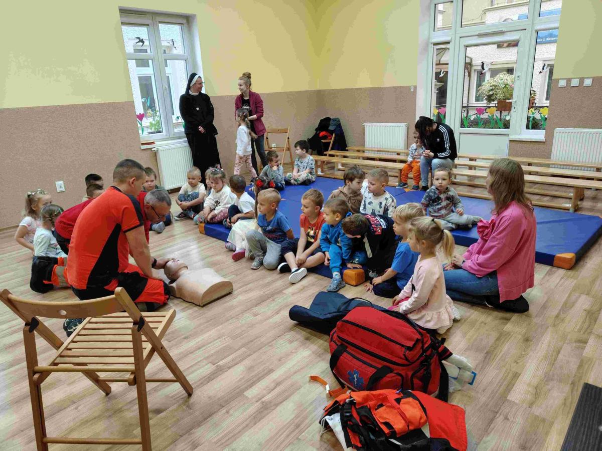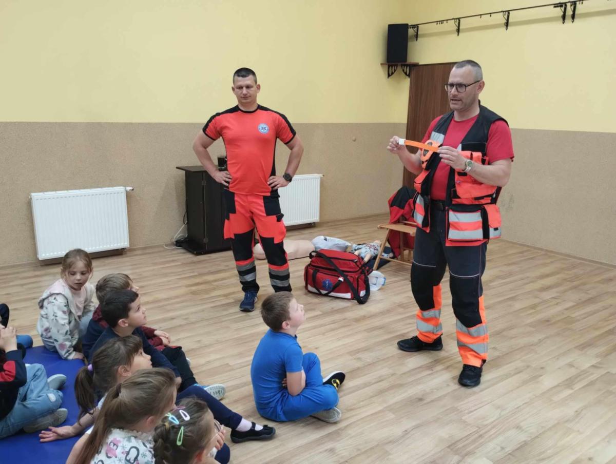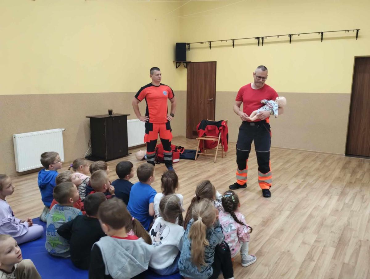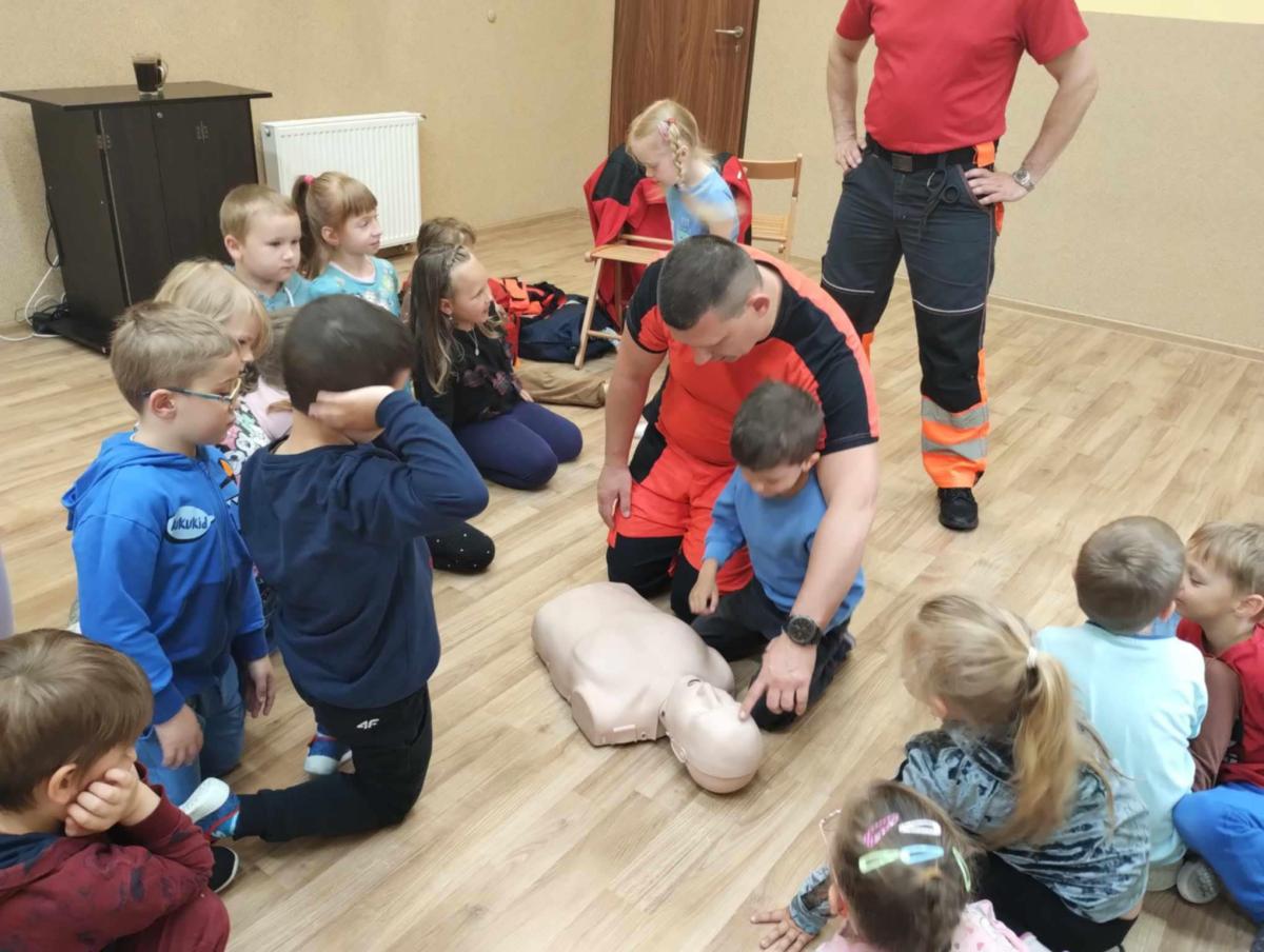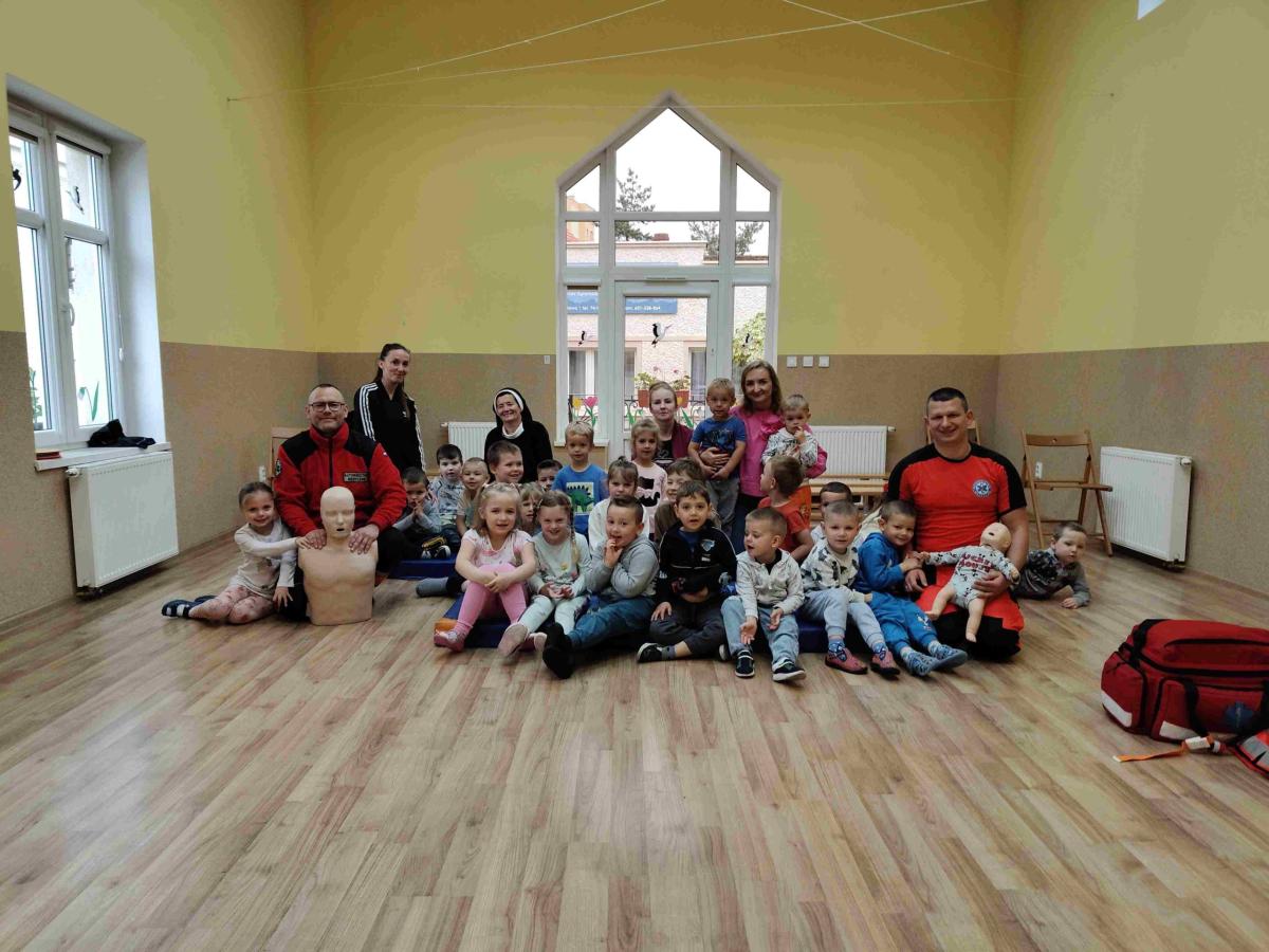 W przedszkolu dzieci uczestniczyły w zajęciach edukacyjnych z zakresu udzielania pierwszej pomocy przedmedycznej, które miały na celu kształtowanie pozytywnych i bezpiecznych postaw oraz zapoznanie najmłodszych z podstawowymi czynnościami ratowniczymi w wypadku nieobecności osób dorosłych. Przedszkolaki dowiedziały się w jaki sposób udziela się pierwszej pomocy, jak pomóc poszkodowanym zanim przyjedzie pogotowie ratunkowe. Dzieci z zainteresowaniem słuchały wskazówek dotyczących zachowania się w sytuacji zagrożenia życia. Nauczyły się podstawowych numerów alarmowych oraz jak wezwać pomoc przez telefon. Przedszkolaki wiedzą do kogo zwracać się gdy czują się zagrożone, same również są świadome konieczności zachowywania się w sposób bezpieczny taki, by apteczka i jej wyposażenie były jak najmniej potrzebne. Zgromadzoną wiedzę będą mogły wykorzystać w przyszłości przychodząc z pomocą koledze lub najbliższym z rodziny. Dzięki praktycznym działaniom nabierają wprawy i przełamują strach, to tu w przedszkolu rodzą się mali bohaterowie. Dziękujemy Ratownikom Medycznym: Panu Witoldowi i Panu Rafałowi prywatnie tatusiom naszych przedszkolaków za dzisiejsze zajęcia i poświęcony nam czas. Bóg zapłać!