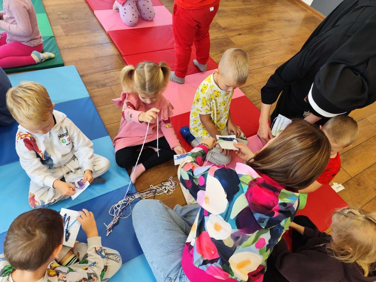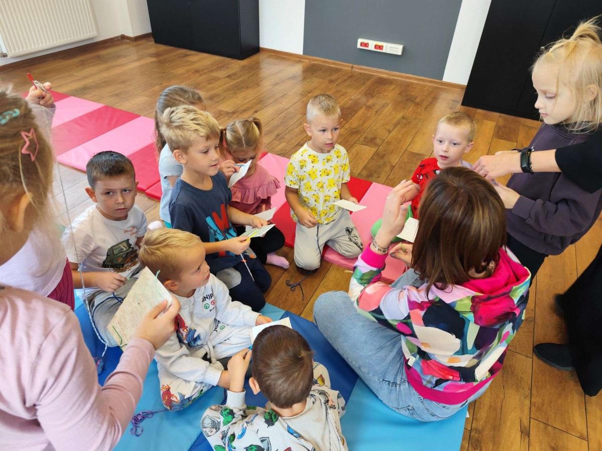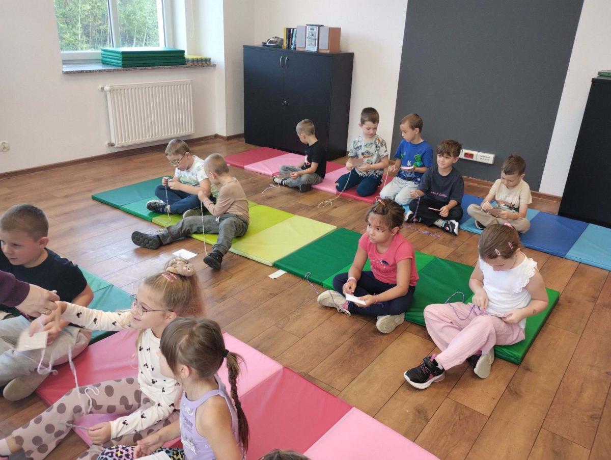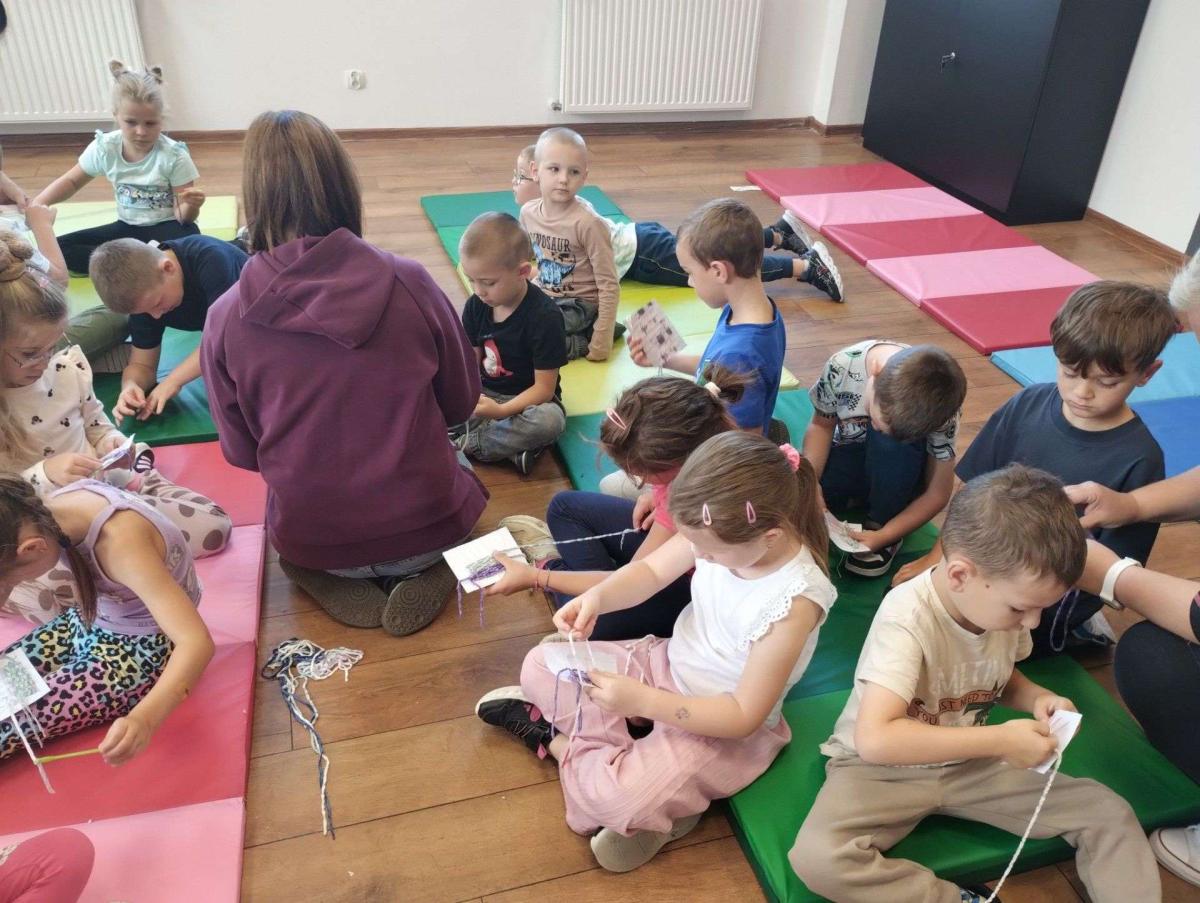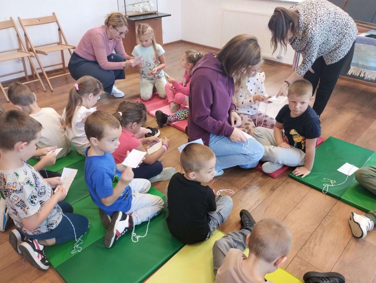 Największą atrakcją była możliwość własnoręcznego wykonania prostego splotu na małych krosnach. Dzieci z zapałem dobierały kolory nici, przewlekały je i obserwowały, jak z pojedynczych włókien powstaje tkana tkanina. Zabawa była nie tylko twórcza, ale również bardzo rozwijająca – ćwiczyła koncentrację, koordynację wzrokowo-ruchową oraz cierpliwość.