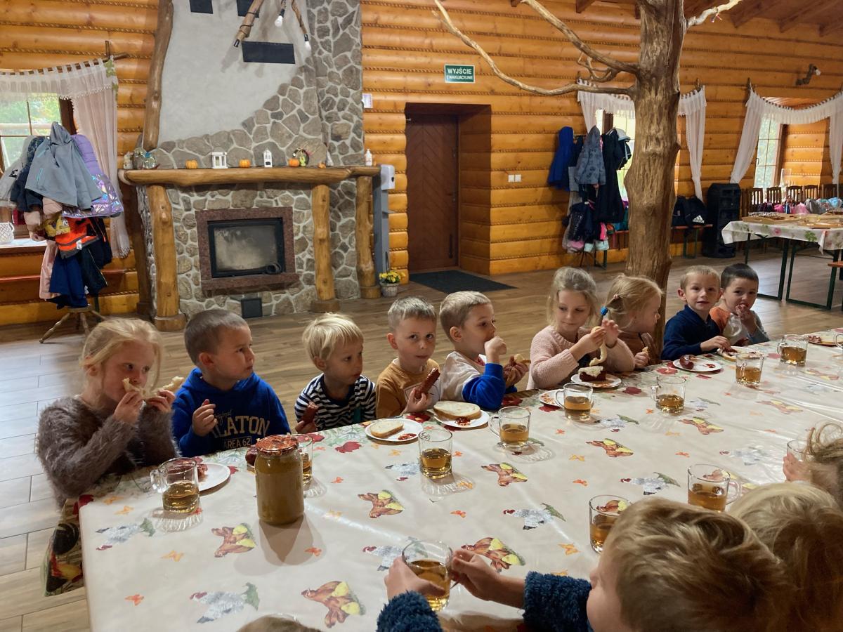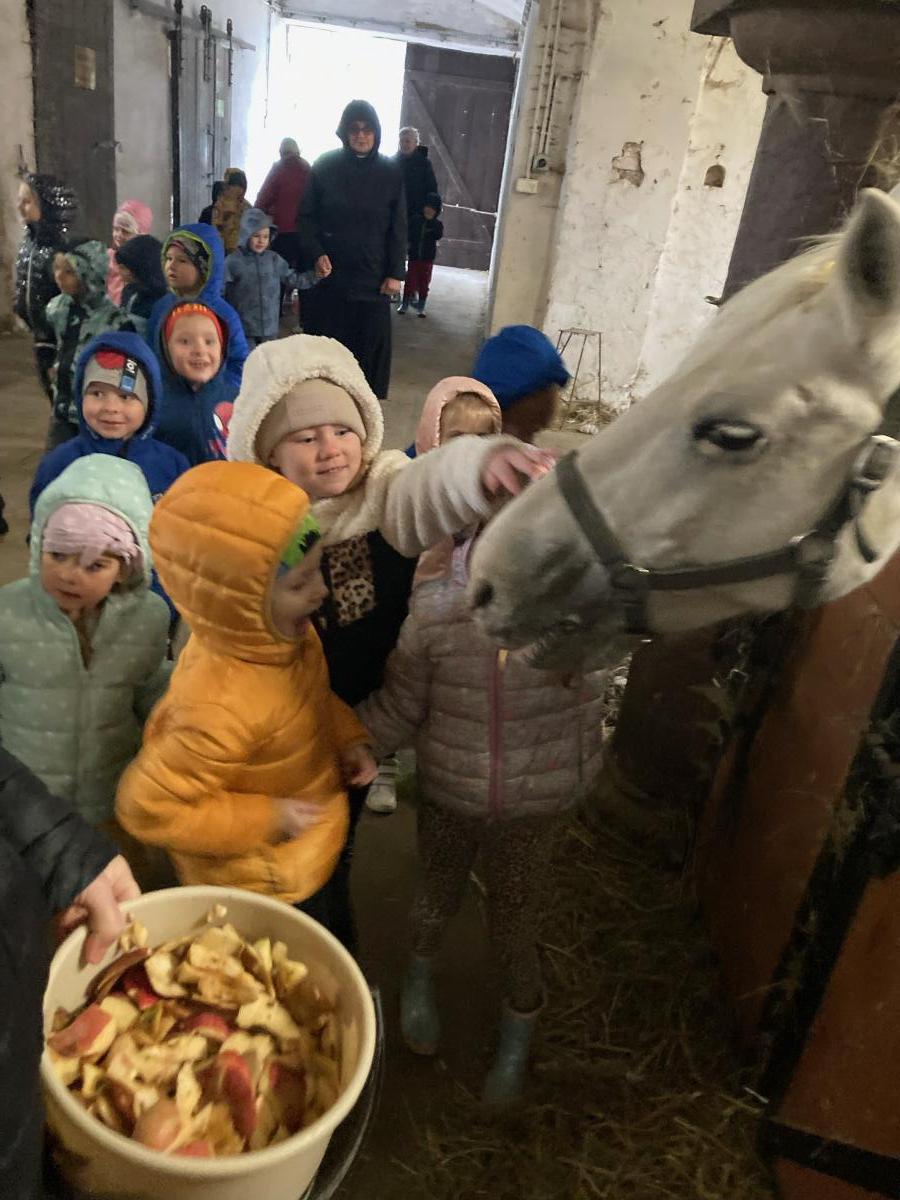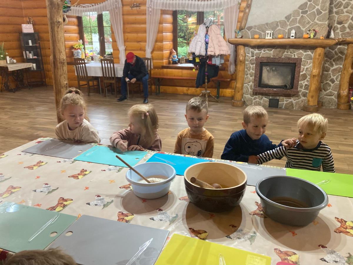 Grupa „Słoneczka”i „Żabki” z Publicznego Przedszkola Integracyjnego w Bielawie w dniu 09.10.2023 uczestniczyła w warsztatach pt. „Dary jesieni” w Zagrodzie Edukacyjnej Marianówek w Dobrocinie. Przedszkolaki zapoznały się z darami jesieni, przede wszystkim z tym, co oferuje nam sad i ogród warzywny oraz wykonanymi z nich przetworami. Wspólnie uczestniczyły w warsztatach wykonując „jabłecznikowy salceson”- sami kroili jabłka, dodawali poszczególne składniki i ucierali ciasto w makutrze. Gdy placek piekł się w piekarniku dzieci zapoznały się ze zwierzętami zamieszkującymi gospodarstwo takim jak: konie, lamy, kozy, świnka, osiołki oraz kury z kogutem, kaczki i gęsi. Po nakarmieniu zwierząt przedszkolaki udały się na pyszną kiełbaskę z chlebkiem i herbatą oraz ciasto, które akurat się upiekło. Dzieciom bardzo podobały się zajęcia i wszystko wyśmienicie smakowało - zwłaszcza ciasto, które same przygotowały. Pychotka! Palce lizać… mniam. Wycieczka była bardzo udana…już nie możemy doczekać się kolejnej.