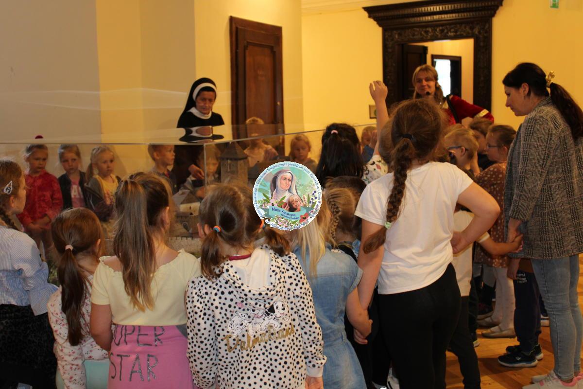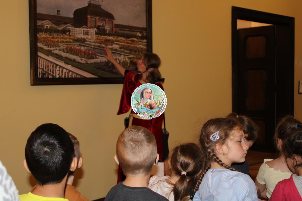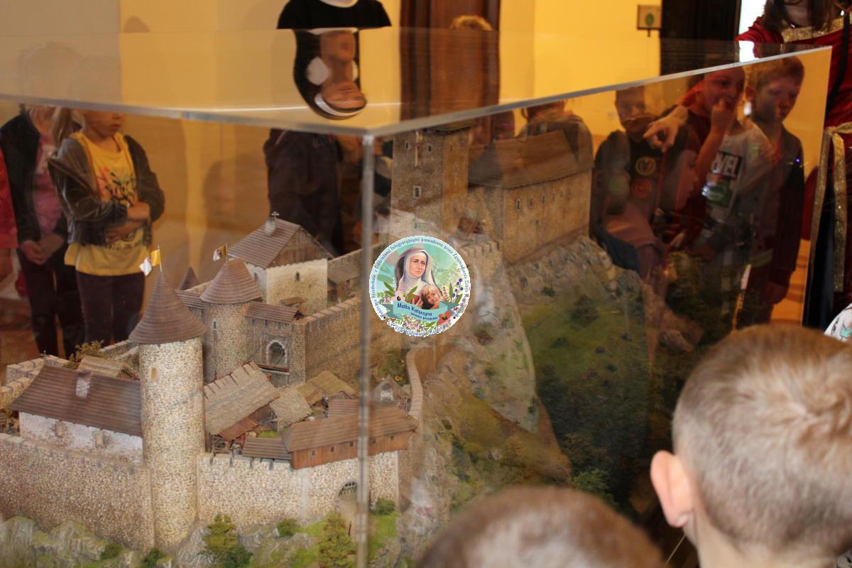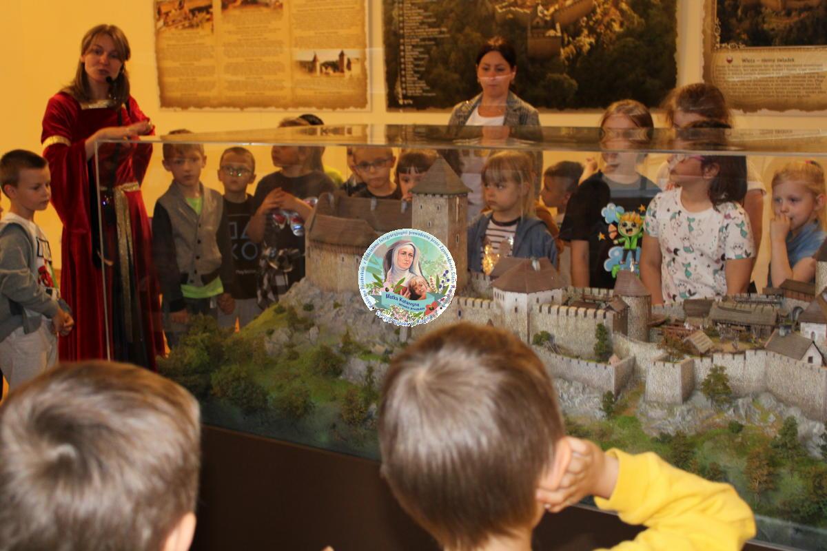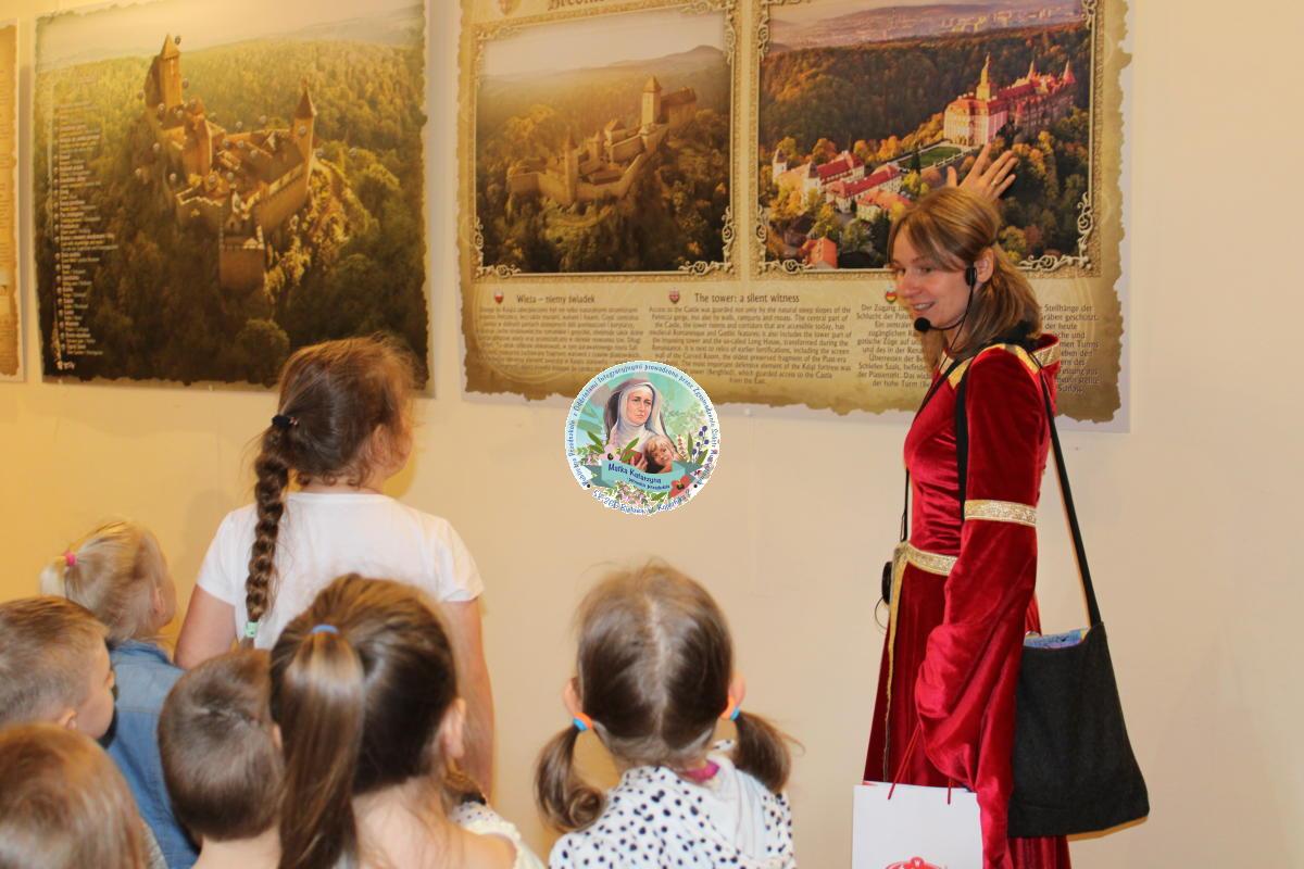 Droga z parkingu do zamku prowadzi przez rozległy park ozdobiony kwitnącymi rododendronami, które zachwycały barwami i wielkimi rozmiarami roślin, mijaliśmy sadzawkę z kwitnącymi nenufarami i damą, która z dzbana wylewała wodę. Przed zamkiem czekała na nas księżniczka. Była to Pani Przewodnik ubrana w szaty dawnej właścicielki zamku - księżnej Anny. Pani Anna pokazywała nam wspaniałe komnaty, meble i opowiadała o życiu właścicieli zamku, których portrety zdobiły wielkie sale. Ciekawą osobą była księżna Daisy, której 7 metrowe perły prezentowała nasza pani Przewodnik. Byliśmy na krótko w sali kinowej, gdzie dzieci oglądały zamek „z lotu ptaka”, a raczej drona. Film pokazał wielkość