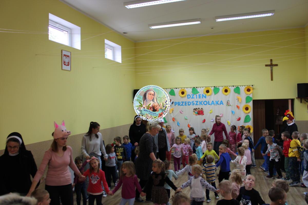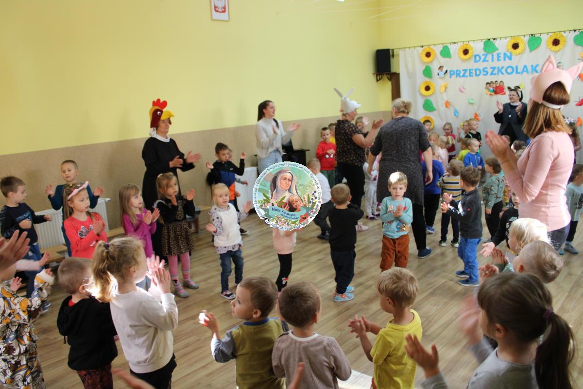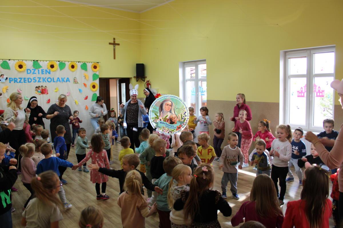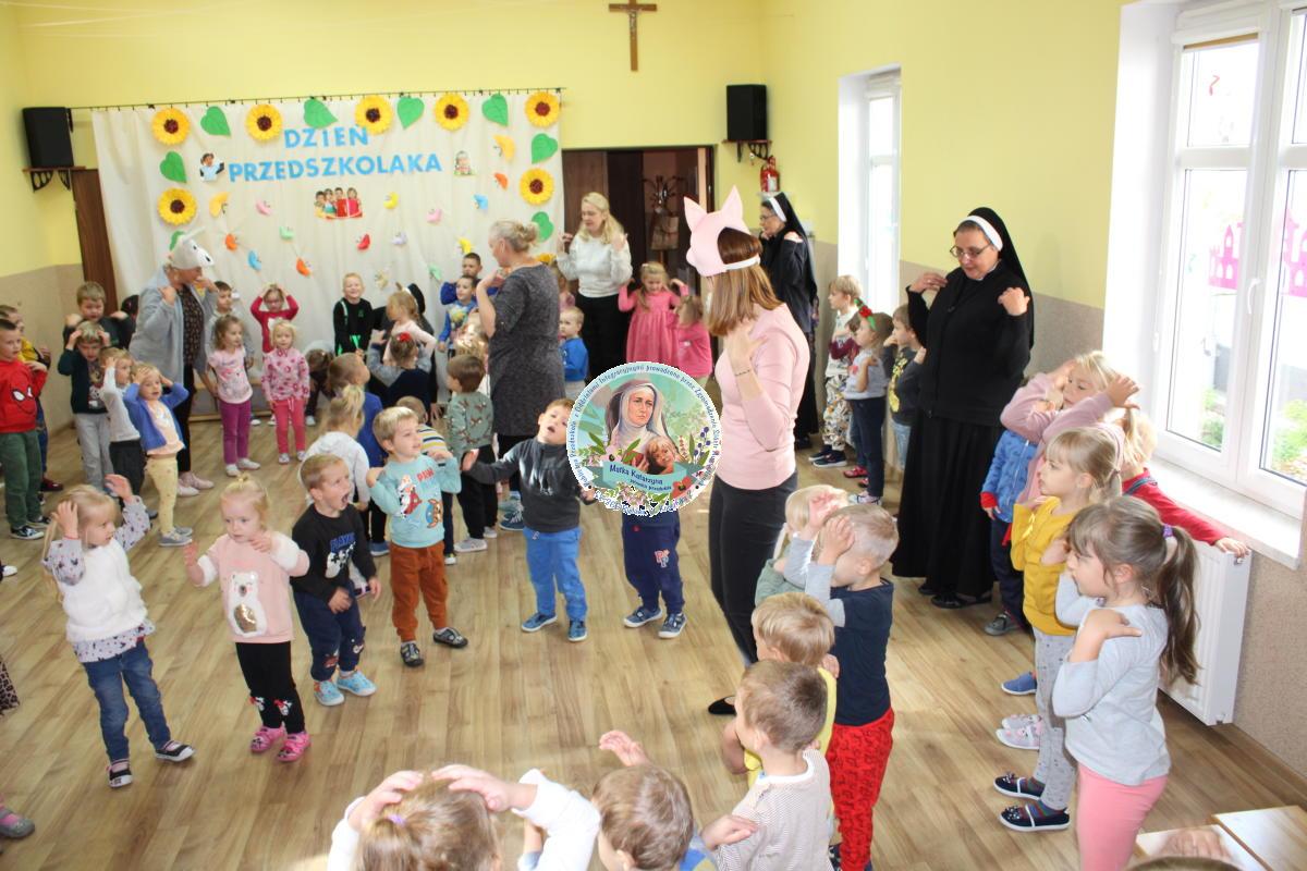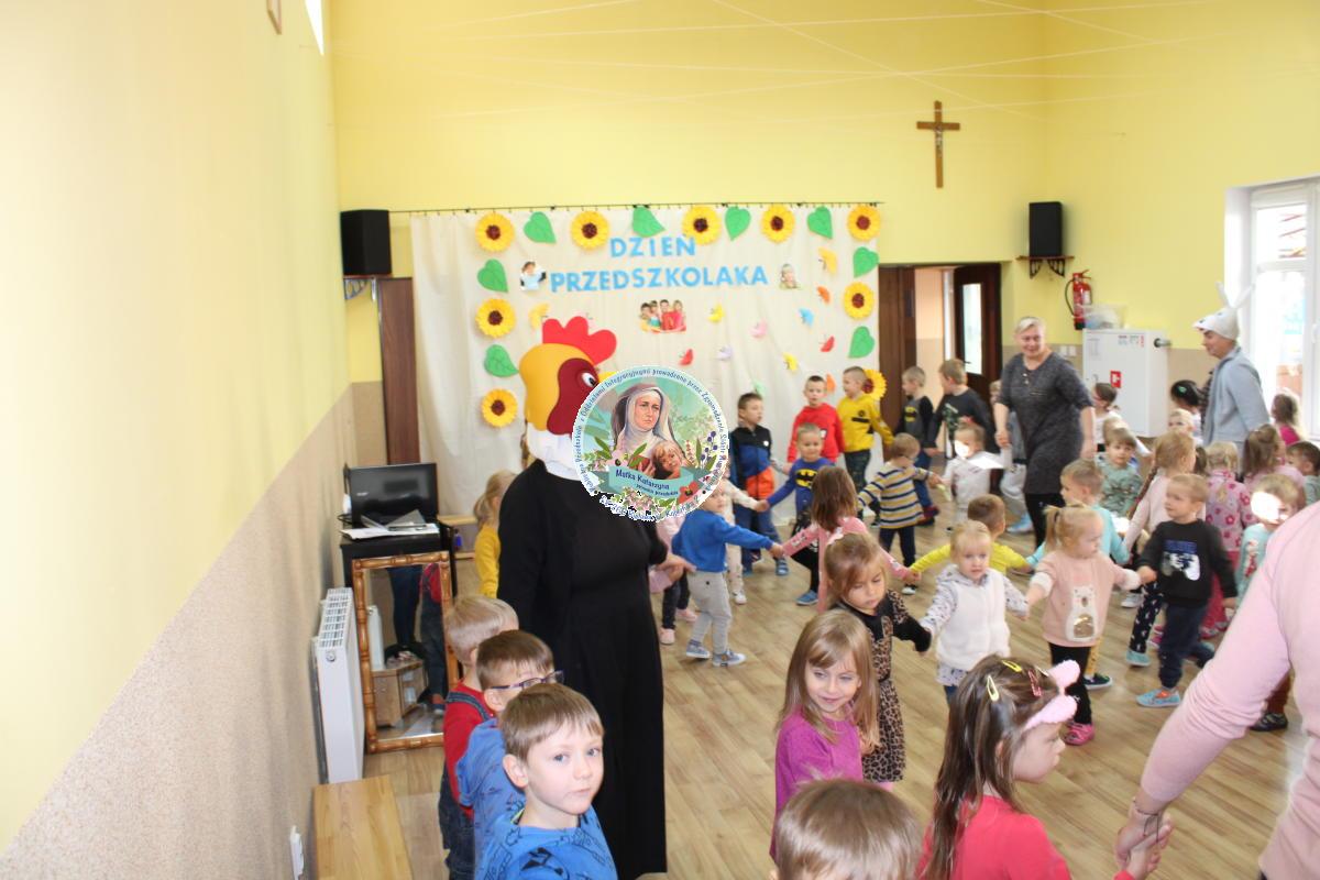 W tym czasie nasza najmłodsza grupa Słoneczek bawiła się wraz ze swoimi Paniami z chustą animacyjną w swojej sali. Wychowawczynie jeszcze tego dnia zorganizowały dla Maluszków sesję zdjęciową z ramką specjalnie przygotowaną na ten dzień. Gdy wszystkie Przedszkolaki wróciły już do przedszkola okazało się, że to nie koniec atrakcji. Panie oraz Siostry przygotowały inscenizację wiersza „Kwoka” autorstwa Jana Brzechwy. Następnie przystąpiliśmy ponownie do wspólnej zabawy w rytm „Kaczuszek”, „Pięty, kciuk” oraz „Głowa, ramiona, kolana, pięty”. Pod koniec dnia dzieci zabrały drobne upominki do domu.  Święto jakim jest Dzień Przedszkolaka, przyniosło nam wiele radości