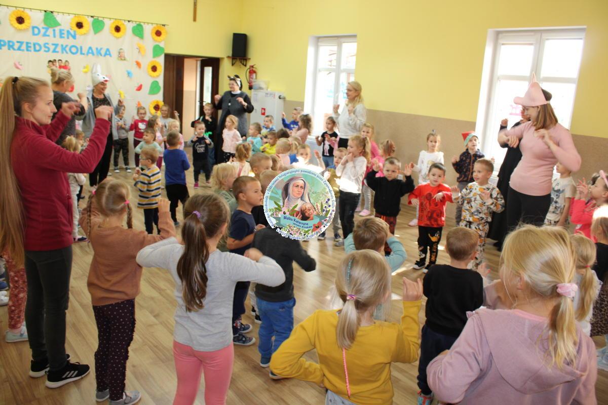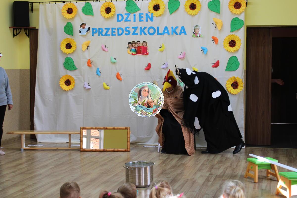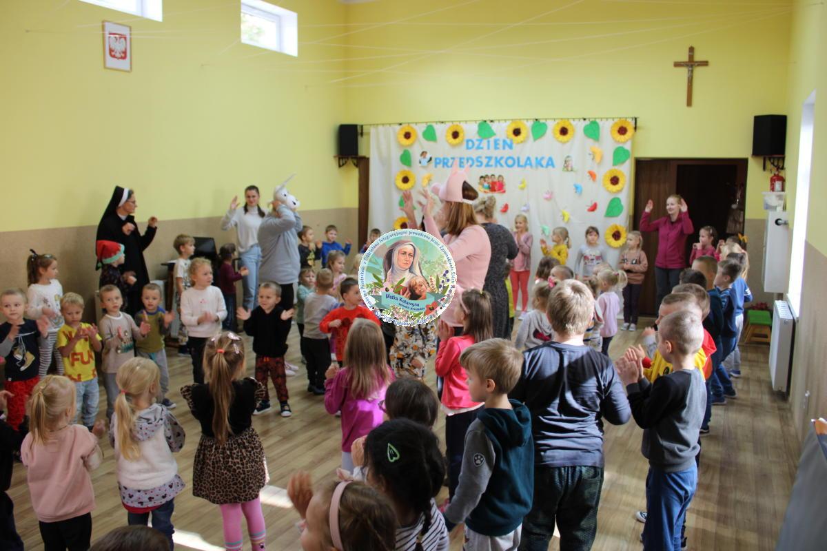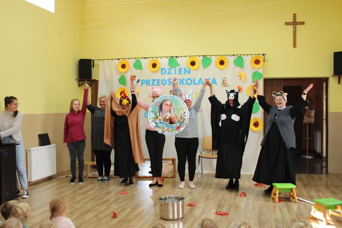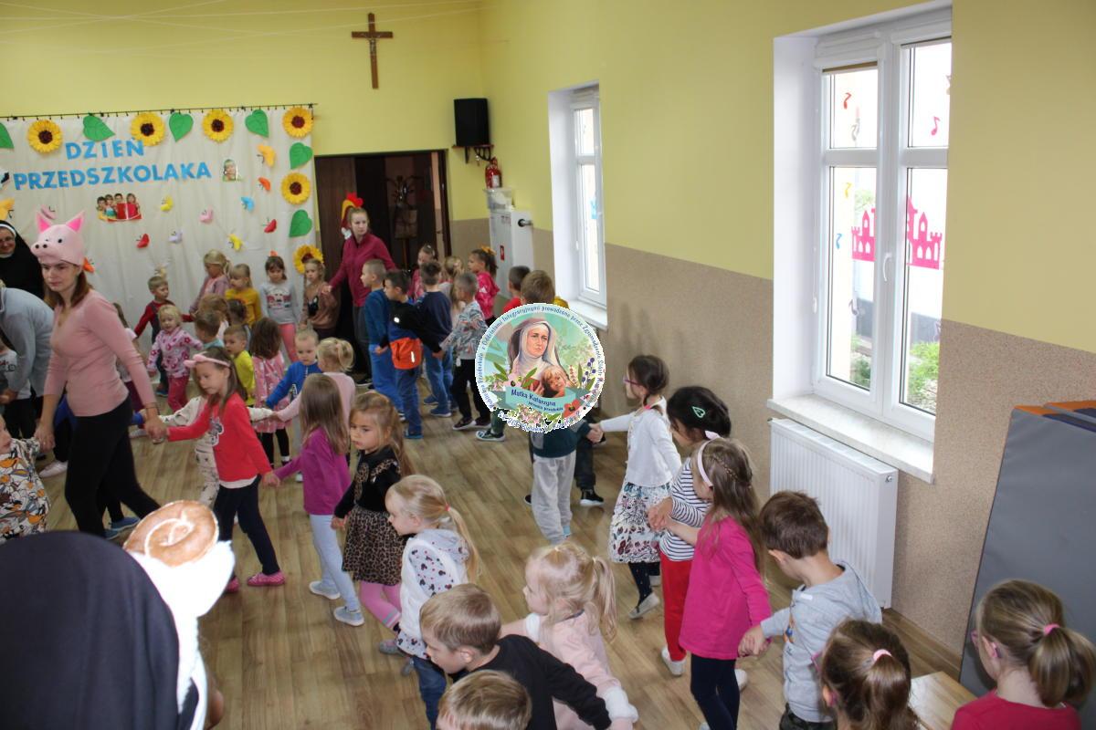 W tym czasie nasza najmłodsza grupa Słoneczek bawiła się wraz ze swoimi Paniami z chustą animacyjną w swojej sali. Wychowawczynie jeszcze tego dnia zorganizowały dla Maluszków sesję zdjęciową z ramką specjalnie przygotowaną na ten dzień. Gdy wszystkie Przedszkolaki wróciły już do przedszkola okazało się, że to nie koniec atrakcji. Panie oraz Siostry przygotowały inscenizację wiersza „Kwoka” autorstwa Jana Brzechwy. Następnie przystąpiliśmy ponownie do wspólnej zabawy w rytm „Kaczuszek”, „Pięty, kciuk” oraz „Głowa, ramiona, kolana, pięty”. Pod koniec dnia dzieci zabrały drobne upominki do domu.  Święto jakim jest Dzień Przedszkolaka, przyniosło nam wiele radości
