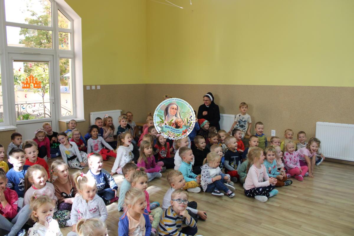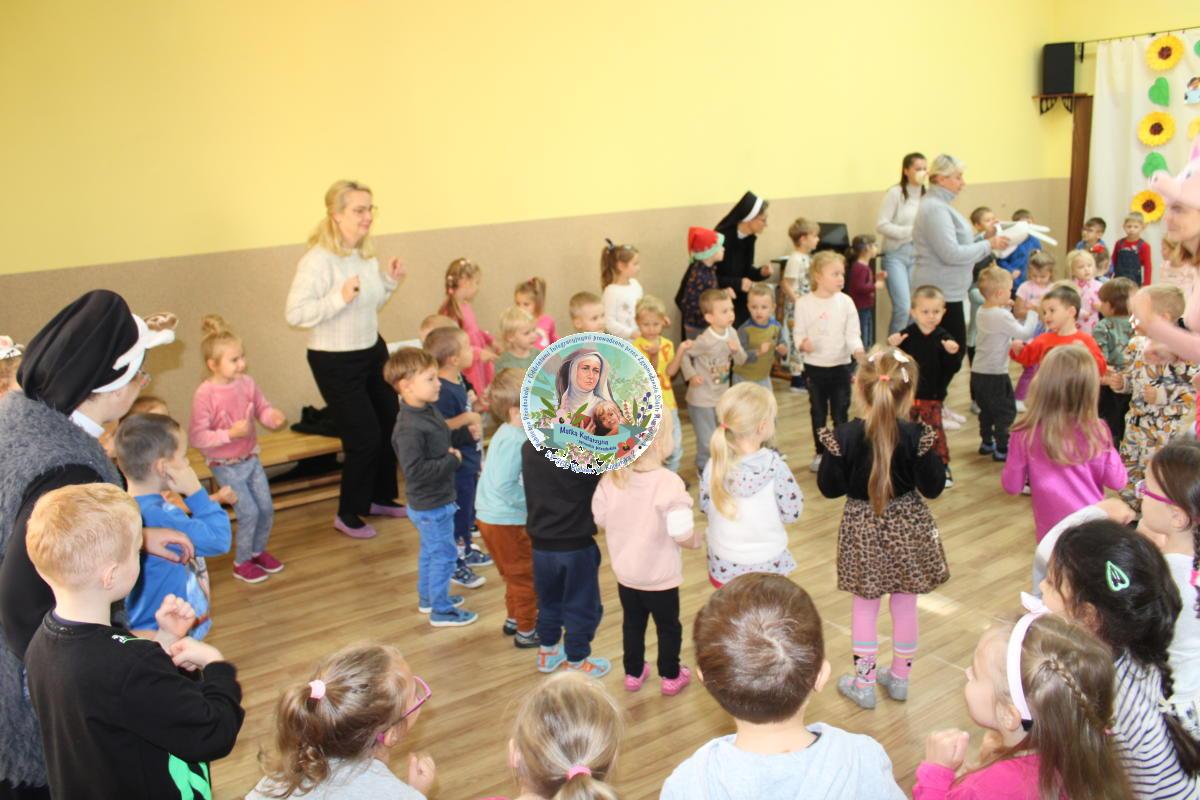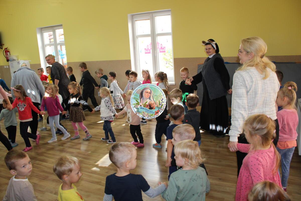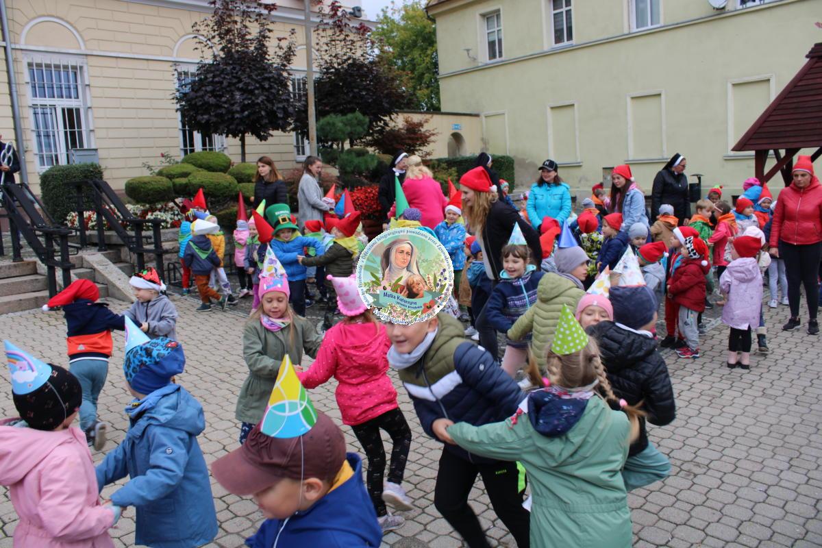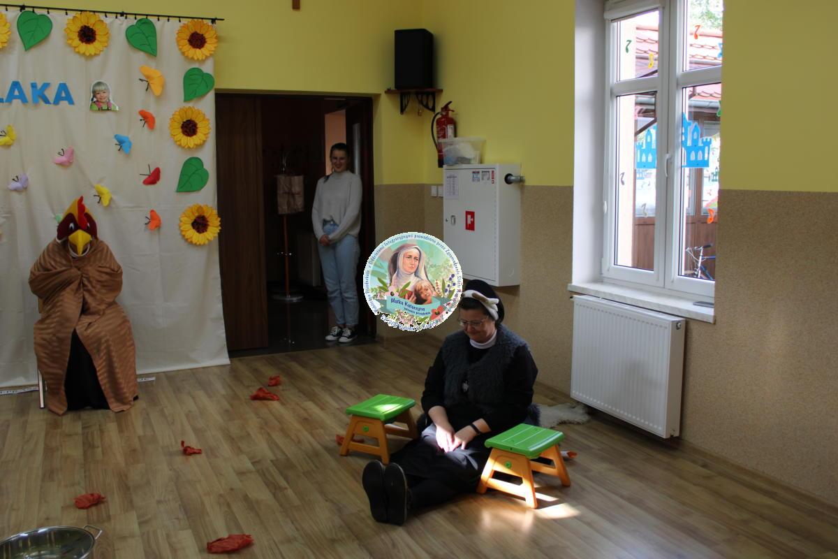 W tym czasie nasza najmłodsza grupa Słoneczek bawiła się wraz ze swoimi Paniami z chustą animacyjną w swojej sali. Wychowawczynie jeszcze tego dnia zorganizowały dla Maluszków sesję zdjęciową z ramką specjalnie przygotowaną na ten dzień. Gdy wszystkie Przedszkolaki wróciły już do przedszkola okazało się, że to nie koniec atrakcji. Panie oraz Siostry przygotowały inscenizację wiersza „Kwoka” autorstwa Jana Brzechwy. Następnie przystąpiliśmy ponownie do wspólnej zabawy w rytm „Kaczuszek”, „Pięty, kciuk” oraz „Głowa, ramiona, kolana, pięty”. Pod koniec dnia dzieci zabrały drobne upominki do domu.  Święto jakim jest Dzień Przedszkolaka, przyniosło nam wiele radości