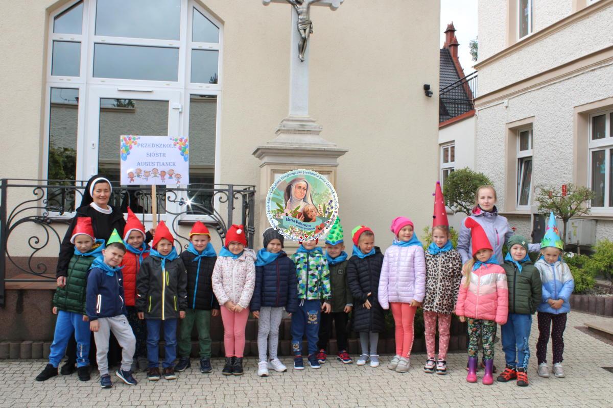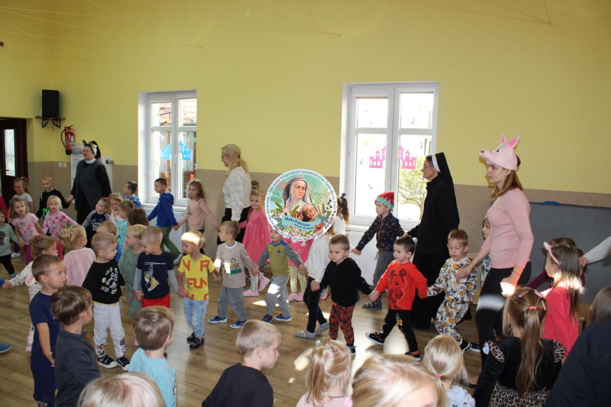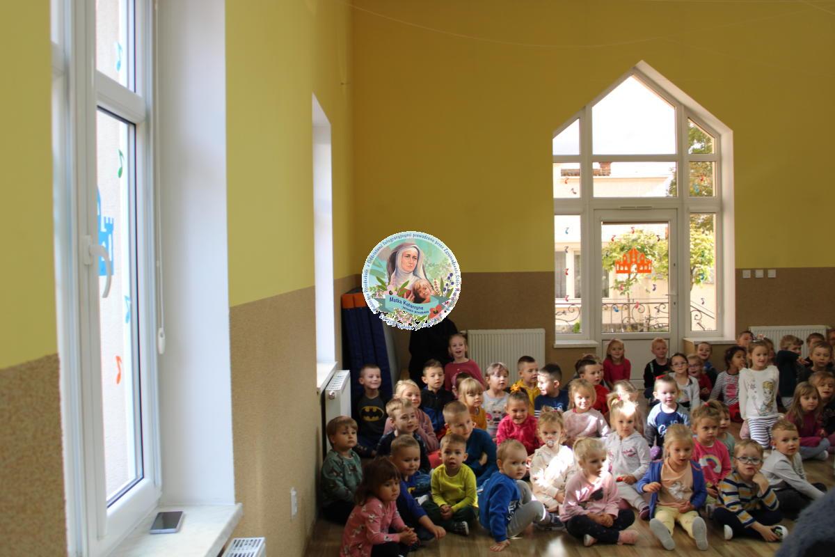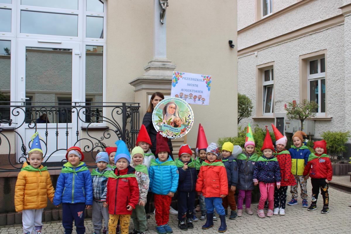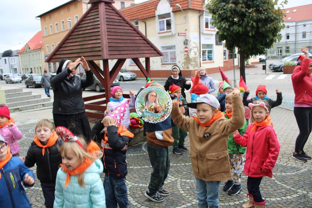 W tym czasie nasza najmłodsza grupa Słoneczek bawiła się wraz ze swoimi Paniami z chustą animacyjną w swojej sali. Wychowawczynie jeszcze tego dnia zorganizowały dla Maluszków sesję zdjęciową z ramką specjalnie przygotowaną na ten dzień. Gdy wszystkie Przedszkolaki wróciły już do przedszkola okazało się, że to nie koniec atrakcji. Panie oraz Siostry przygotowały inscenizację wiersza „Kwoka” autorstwa Jana Brzechwy. Następnie przystąpiliśmy ponownie do wspólnej zabawy w rytm „Kaczuszek”, „Pięty, kciuk” oraz „Głowa, ramiona, kolana, pięty”. Pod koniec dnia dzieci zabrały drobne upominki do domu.  Święto jakim jest Dzień Przedszkolaka, przyniosło nam wiele radości
