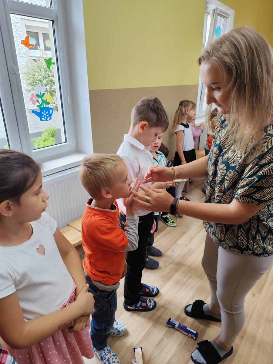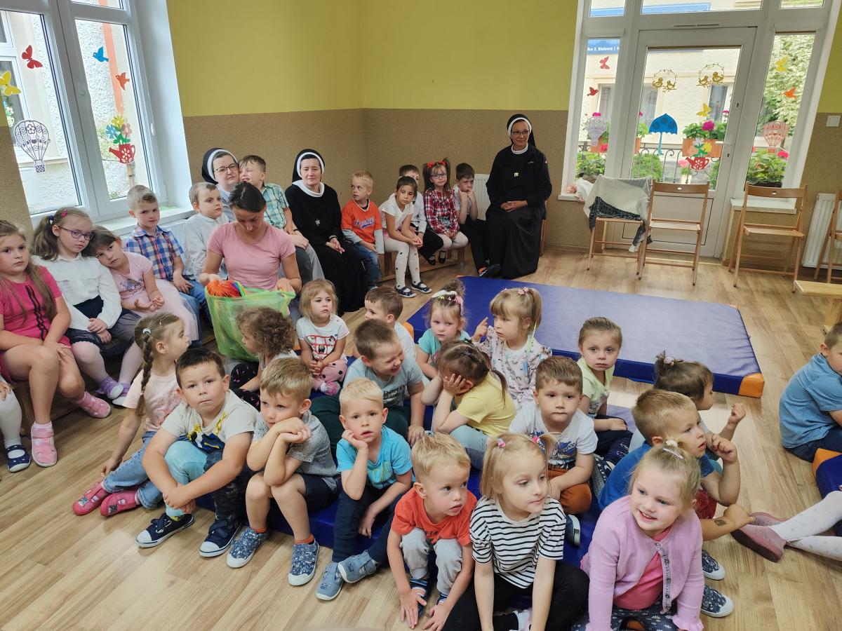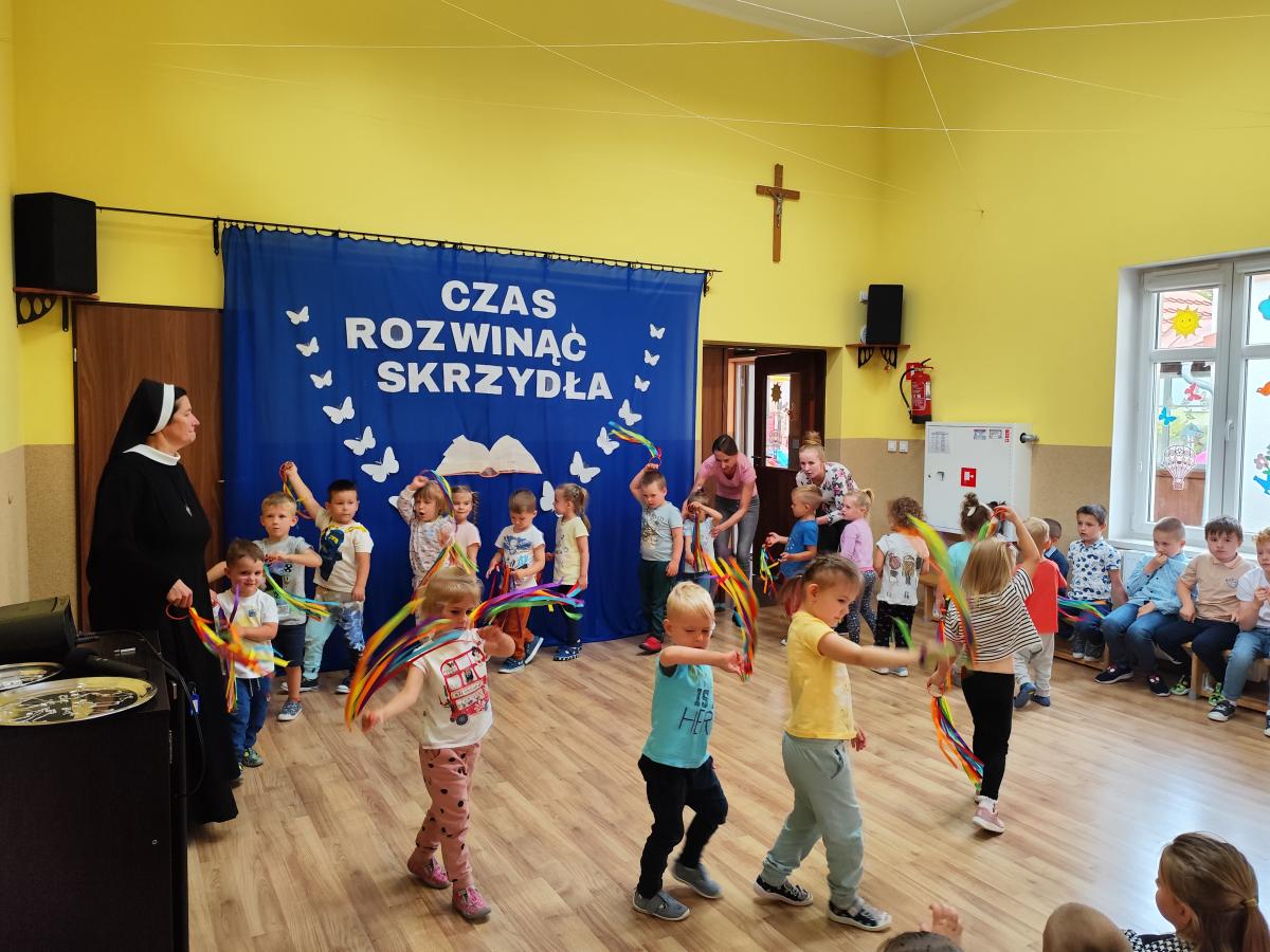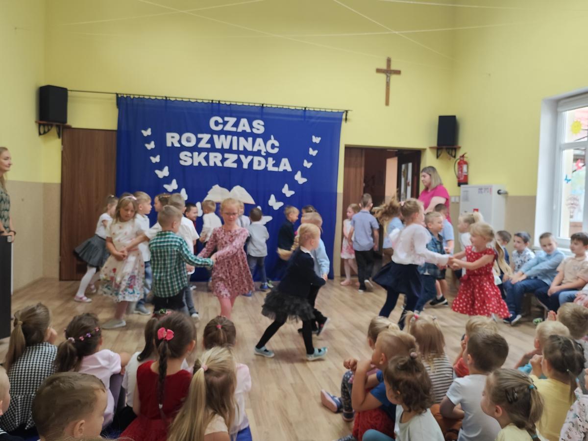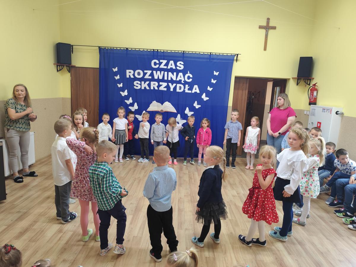 Dnia 12.06.2024 młodsze grupy uroczyście żegnały swoich starszych kolegów, którzy od września rozpoczynają naukę w szkole. Oprócz wierszy i piosenek nie zabrakło wspólnych tańców. Na początku scenę zajęły "Żabki" i dzieci 5-letnie z grupy "Sówki" wykonując taniec do utworu "Clap, Clap Sound". Po nich wystąpiły "Słoneczka" - Kinga wyrecytowała wierszyk z akcentem humorystycznym a grupa wspólnie wykonała taniec do piosenki "Pięta, palec". Na koniec wystąpiły "Jagódki" i zaprezentowały występ z kolorowymi wstążkami do utworu "Żegnamy starszaków" i taniec do piosenki "Nogi stonogi". Po wszystkich wykonaniach przyszedł czas na wspólną modlitwę i wręczenie wszystkim zerówkowiczom upominków oraz medalików poświęconych przez Kapłana. Starszaki oczywiście nie pozostały dłużne i na koniec pięknie zaśpiewały dla Nas piosenki z okazji zakończenia przedszkola.