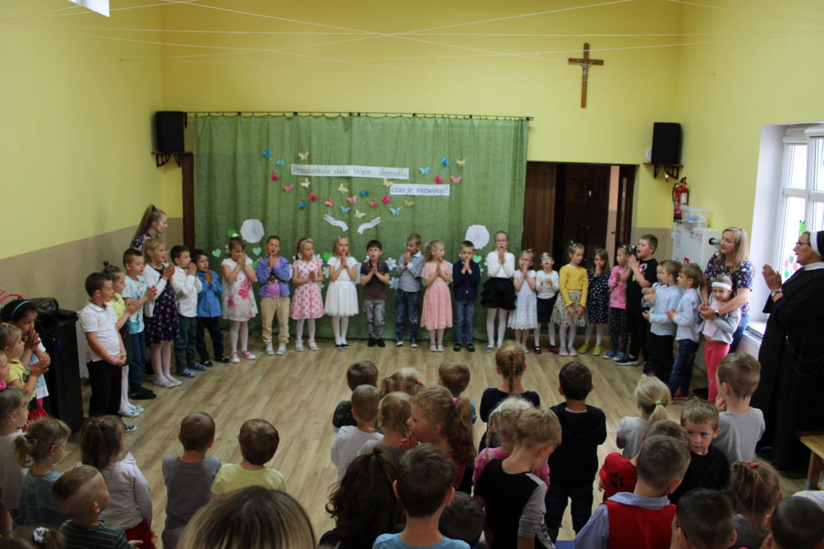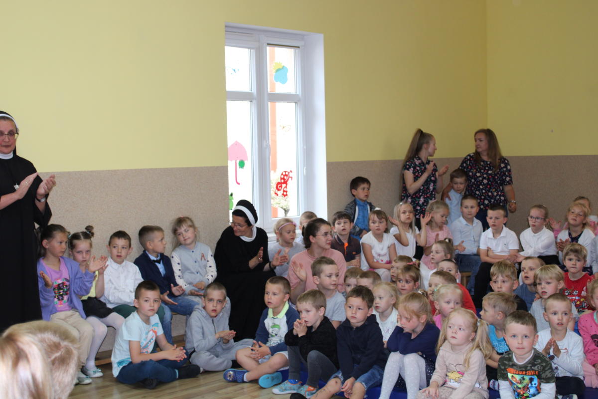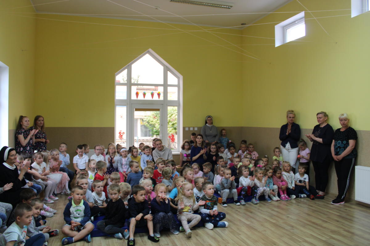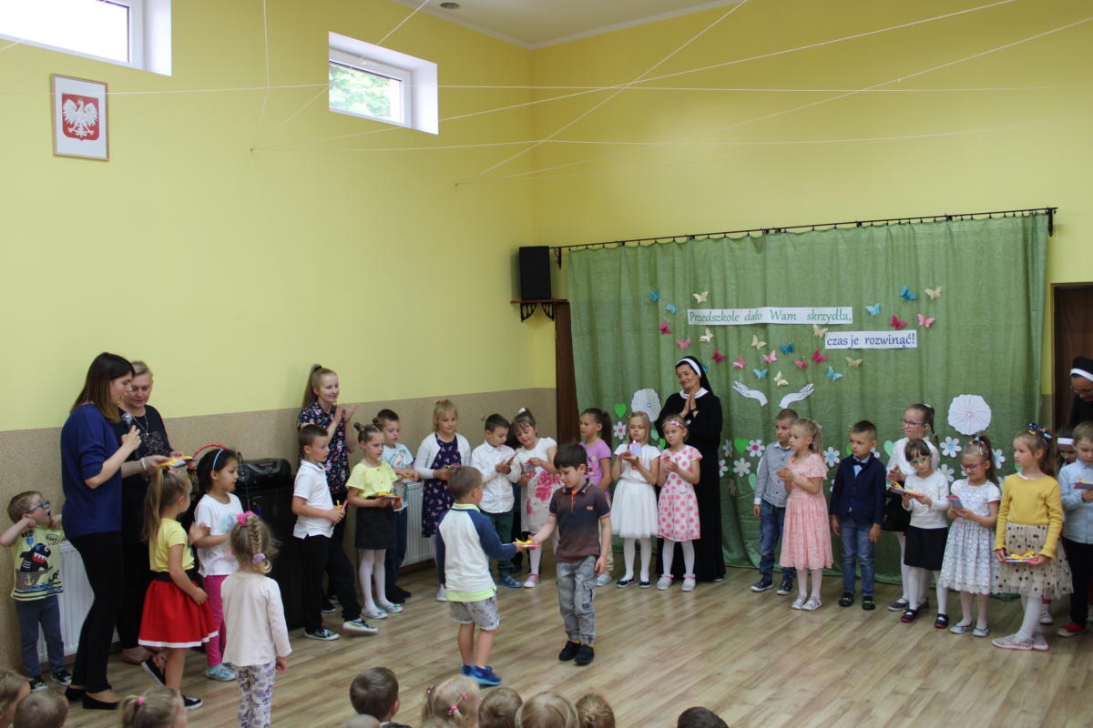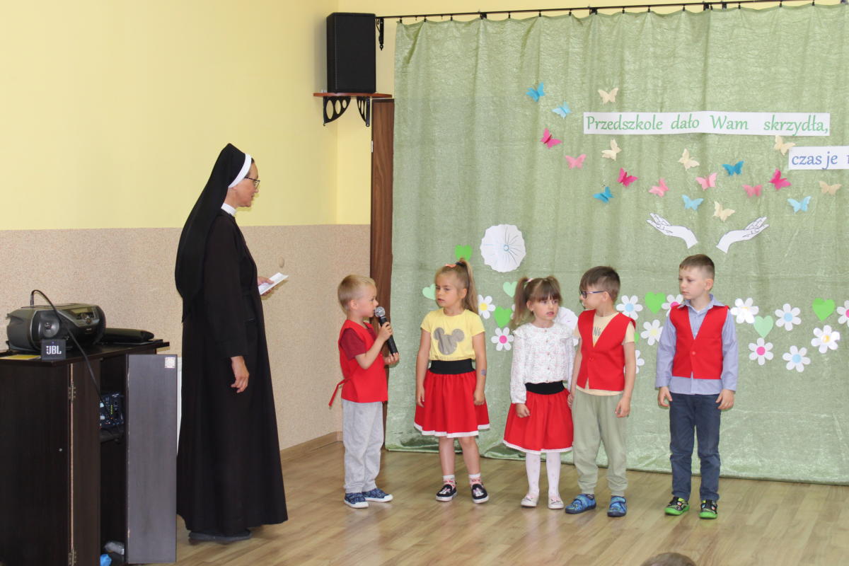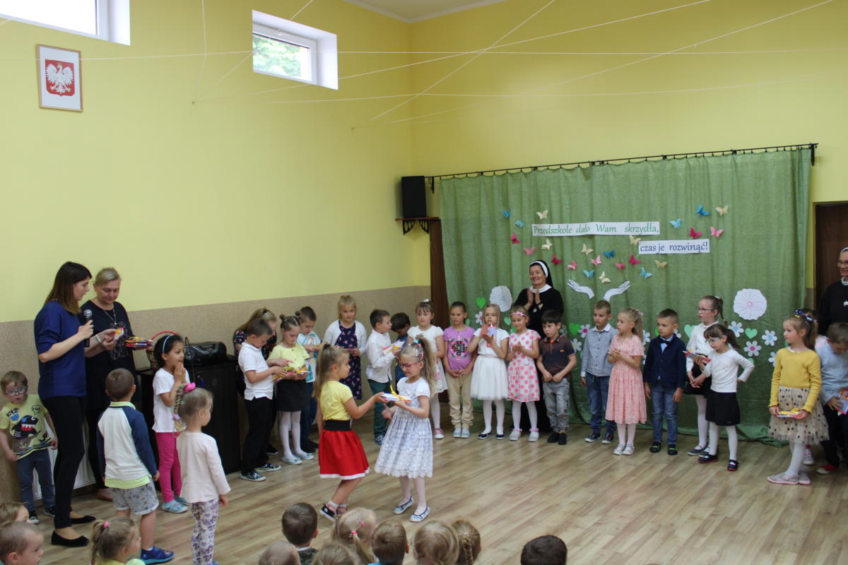 W dniu dzisiejszym młodsze przedszkolaki pożegnały swoich starszych kolegów i koleżanki, których po wakacjach czeka już nowa przygoda w szkole. Spotkanie rozpoczęliśmy gorącą modlitwą za naszych absolwentów, oddając ich w szczególną opiekę Maryi. Zostali obdarowani niezwykłym upominkiem – cudownym medalikiem Matki Bożej Niepokalanej, by pod Jej płaszczem radośnie wzrastali przez dalsze lata nauki. Nasi „zerówkarze” z zainteresowaniem obejrzeli przygotowany program, wysłuchali piosenek i wierszy, obejrzeli tańce i zostali obdarowani drobnymi prezencikami. Całość spotkania upłynęła w podniosłej i radosnej atmosferze, chociaż niejednemu zakręciła się łezka w oku. Naszym kochanym absolwentom życzymy wielu łask Bożych i sukcesów w szkole.