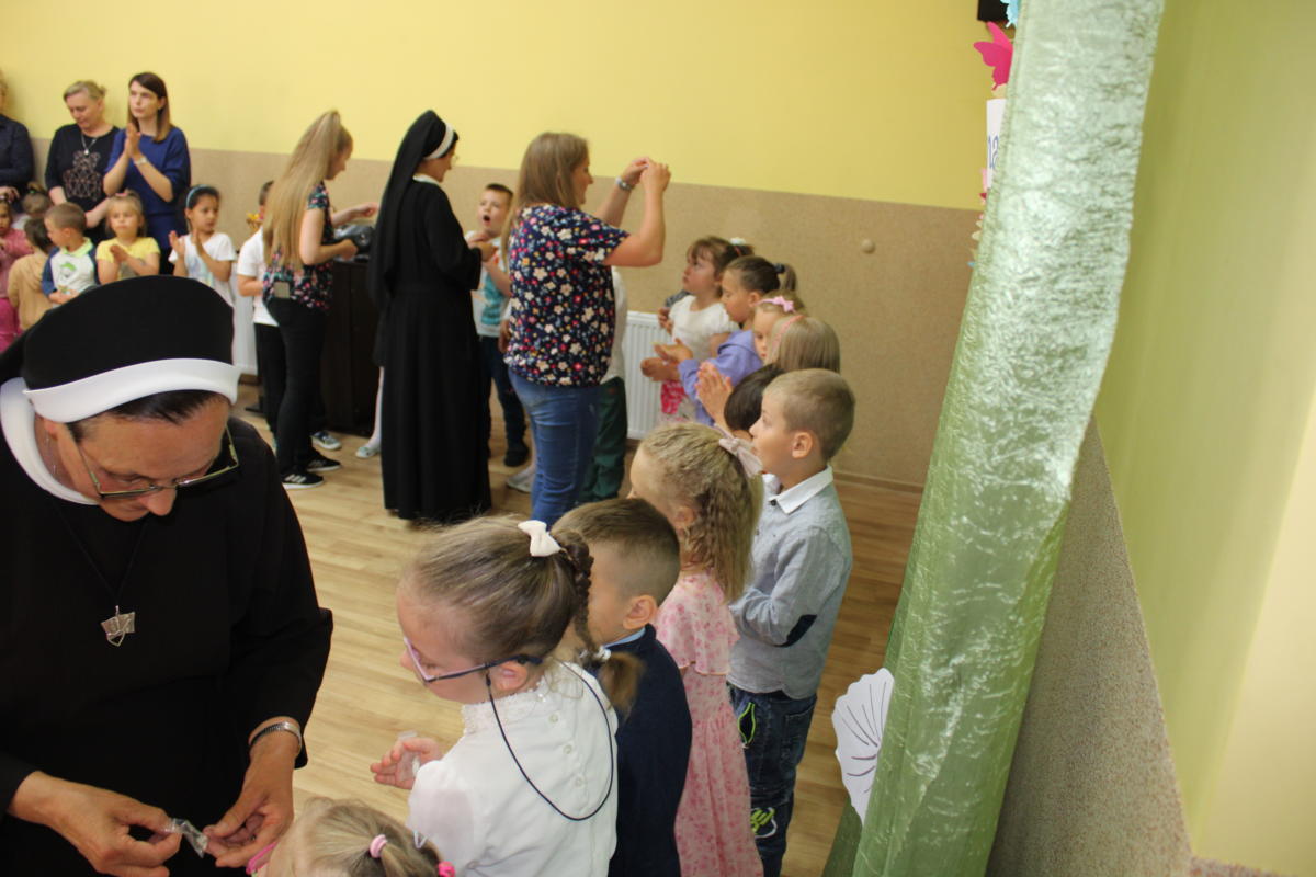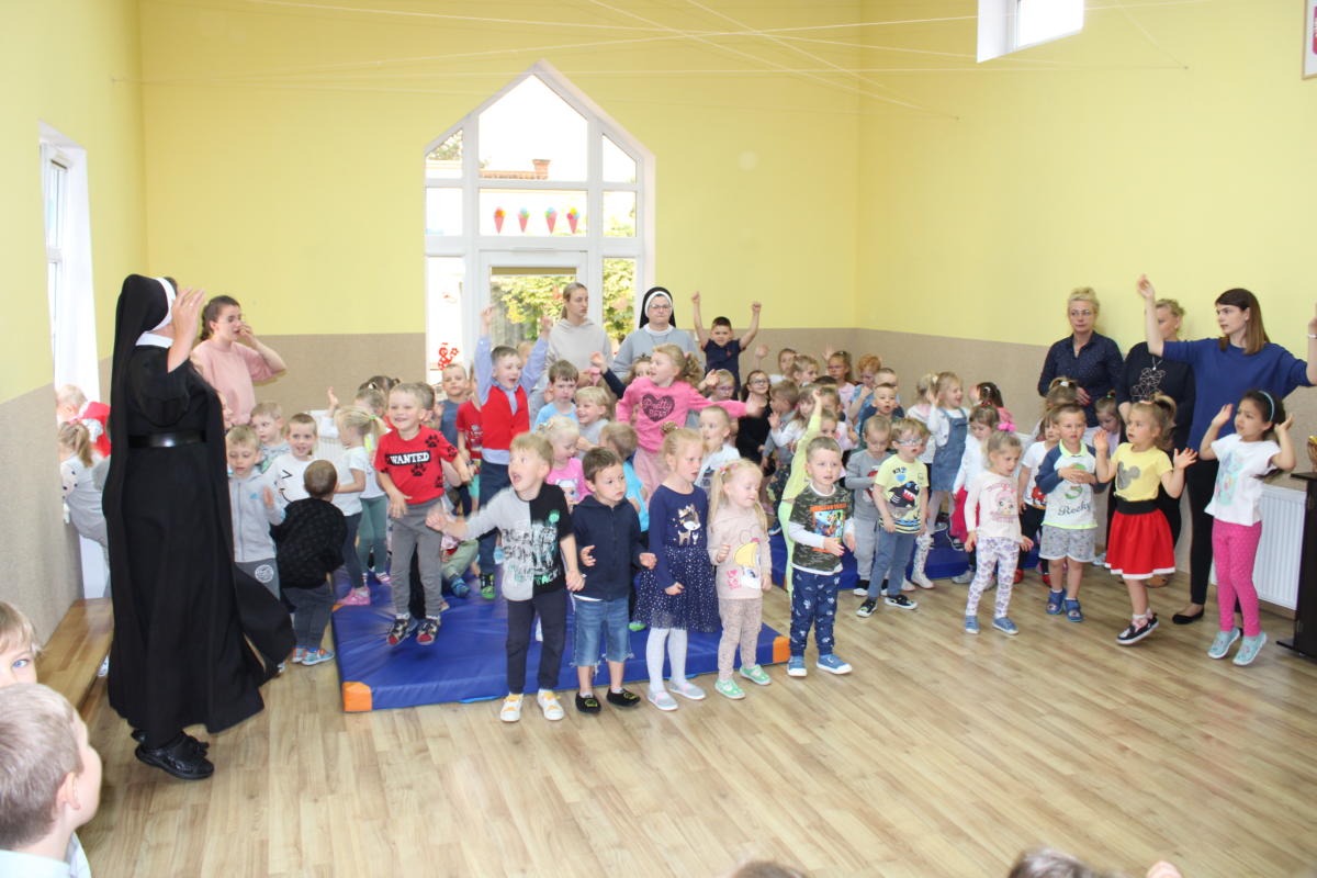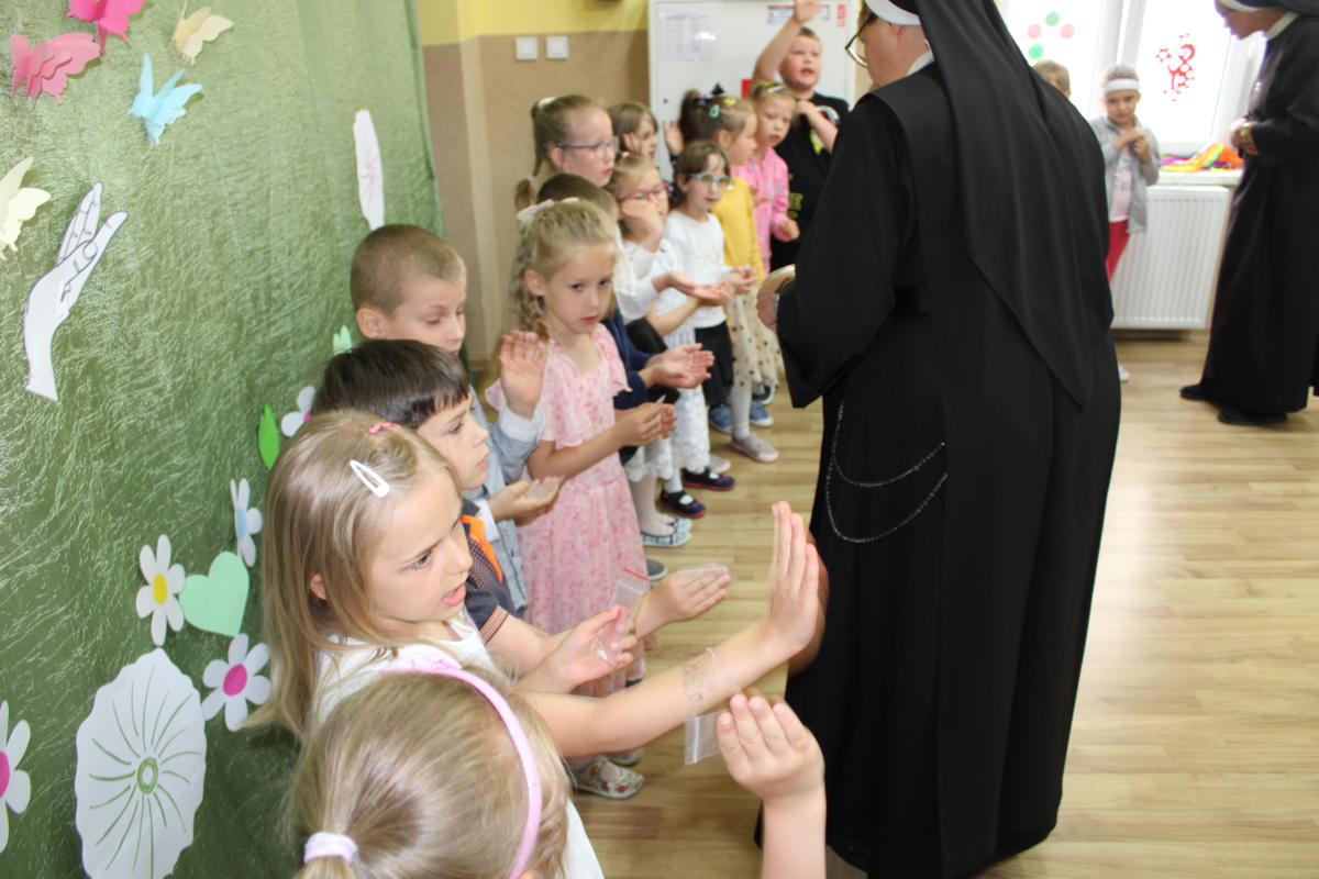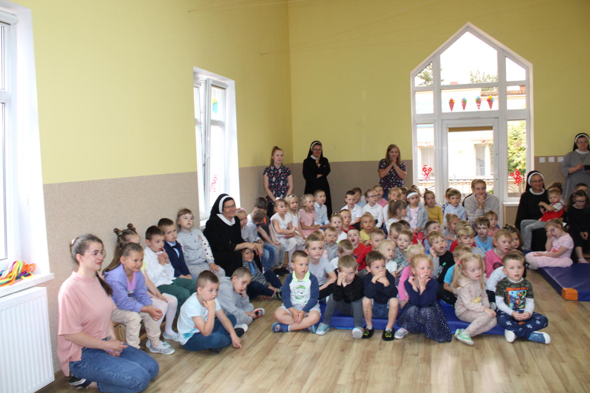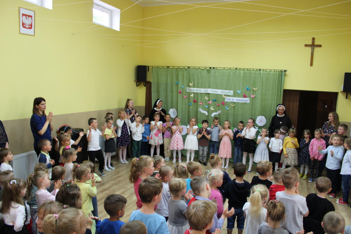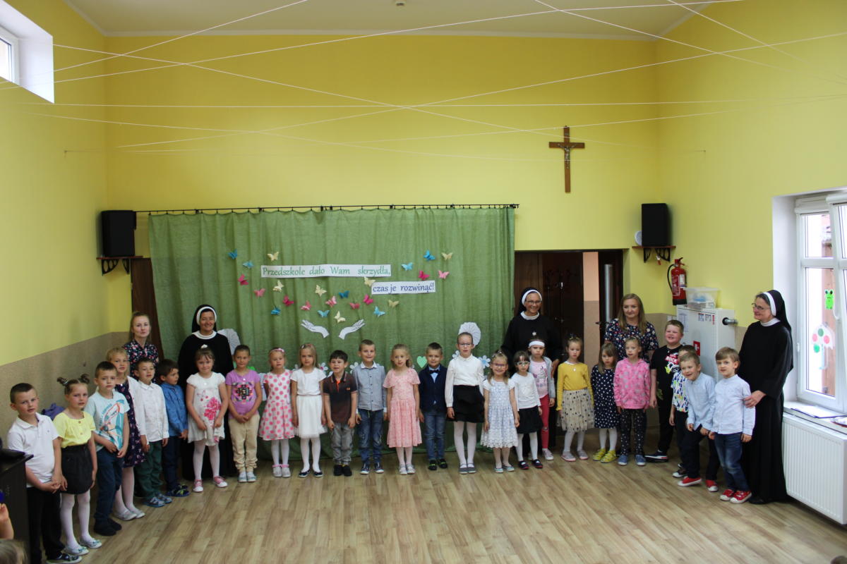 W dniu dzisiejszym młodsze przedszkolaki pożegnały swoich starszych kolegów i koleżanki, których po wakacjach czeka już nowa przygoda w szkole. Spotkanie rozpoczęliśmy gorącą modlitwą za naszych absolwentów, oddając ich w szczególną opiekę Maryi. Zostali obdarowani niezwykłym upominkiem – cudownym medalikiem Matki Bożej Niepokalanej, by pod Jej płaszczem radośnie wzrastali przez dalsze lata nauki. Nasi „zerówkarze” z zainteresowaniem obejrzeli przygotowany program, wysłuchali piosenek i wierszy, obejrzeli tańce i zostali obdarowani drobnymi prezencikami. Całość spotkania upłynęła w podniosłej i radosnej atmosferze, chociaż niejednemu zakręciła się łezka w oku. Naszym kochanym absolwentom życzymy wielu łask Bożych i sukcesów w szkole.