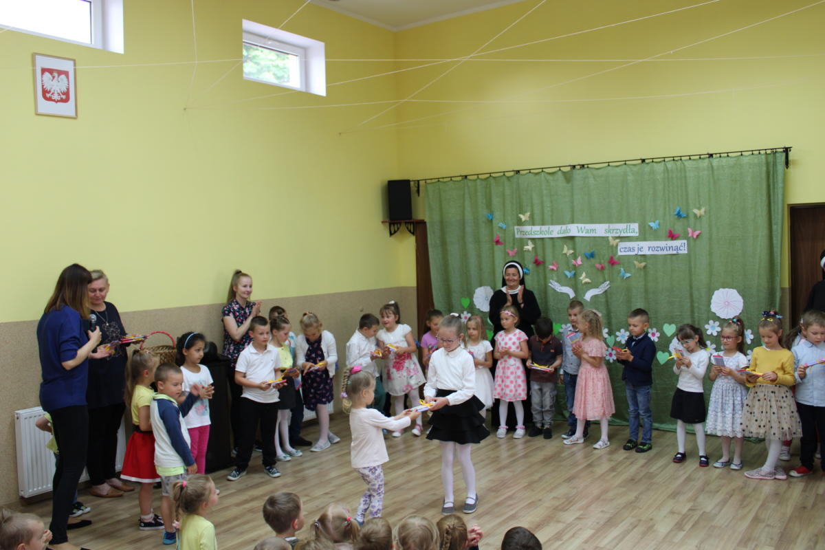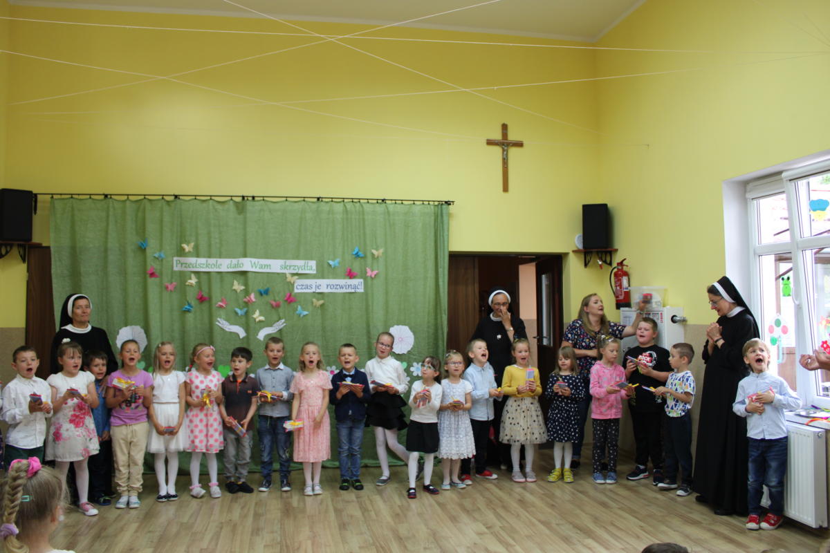 W dniu dzisiejszym młodsze przedszkolaki pożegnały swoich starszych kolegów i koleżanki, których po wakacjach czeka już nowa przygoda w szkole. Spotkanie rozpoczęliśmy gorącą modlitwą za naszych absolwentów, oddając ich w szczególną opiekę Maryi. Zostali obdarowani niezwykłym upominkiem – cudownym medalikiem Matki Bożej Niepokalanej, by pod Jej płaszczem radośnie wzrastali przez dalsze lata nauki. Nasi „zerówkarze” z zainteresowaniem obejrzeli przygotowany program, wysłuchali piosenek i wierszy, obejrzeli tańce i zostali obdarowani drobnymi prezencikami. Całość spotkania upłynęła w podniosłej i radosnej atmosferze, chociaż niejednemu zakręciła się łezka w oku. Naszym kochanym absolwentom życzymy wielu łask Bożych i sukcesów w szkole.