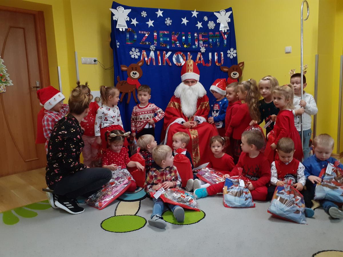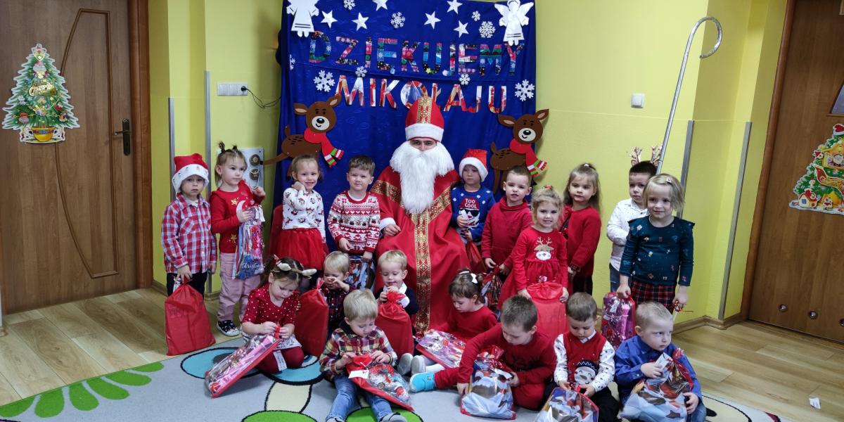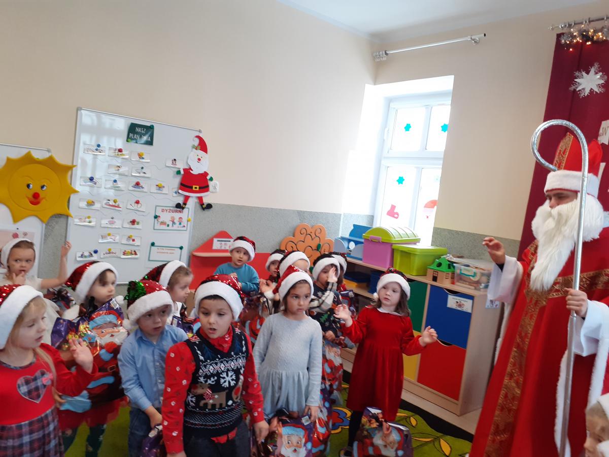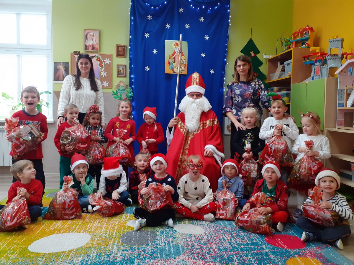 „Co za radość - taki gość, dzyń, dzyń dzwoni dzwoneczkami i ma worek z prezentami”…. Już od kilku dni w główkach dzieci jedna myśl „Kiedy przyjdzie św. Mikołaj.”?  W przeddzień Jego wizyty w każdej sali został ustawiony okazały tron dla Gościa odpowiednio przystrojony. Wreszcie nadszedł upragniony dzień. Od samego rana  w grupach atmosfera uroczystego oczekiwania. Św. Mikołaj ubrany w biskupie szaty najpierw poszedł do „Jagódek” najmłodszej grupy. Przyniósł ze sobą ogromny kosz z prezentami. Każde dziecko z drżeniem serca oczekiwało kiedy Święty wręczy prezent i bez lęku odbierało swój podarek.