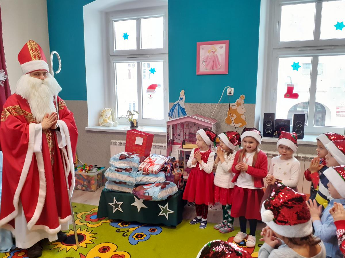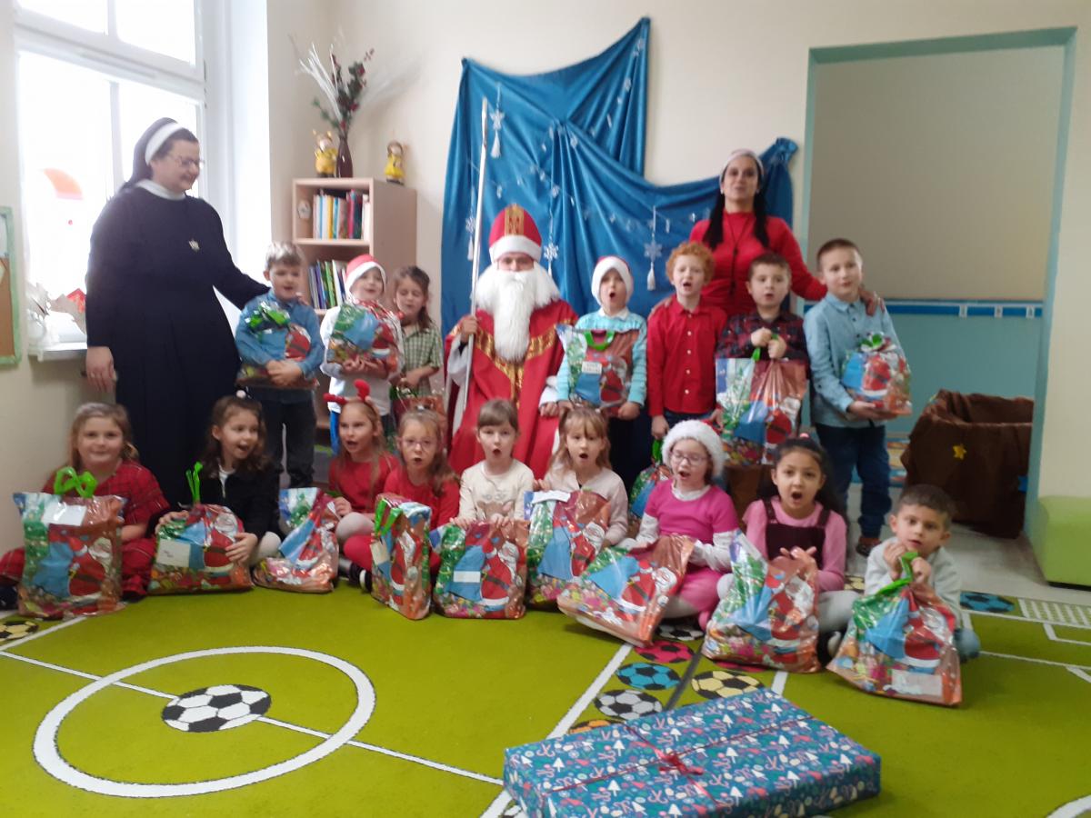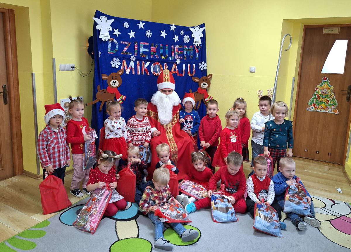 „Co za radość - taki gość, dzyń, dzyń dzwoni dzwoneczkami i ma worek z prezentami”…. Już od kilku dni w główkach dzieci jedna myśl „Kiedy przyjdzie św. Mikołaj.”?  W przeddzień Jego wizyty w każdej sali został ustawiony okazały tron dla Gościa odpowiednio przystrojony. Wreszcie nadszedł upragniony dzień. Od samego rana  w grupach atmosfera uroczystego oczekiwania. Św. Mikołaj ubrany w biskupie szaty najpierw poszedł do „Jagódek” najmłodszej grupy. Przyniósł ze sobą ogromny kosz z prezentami. Każde dziecko z drżeniem serca oczekiwało kiedy Święty wręczy prezent i bez lęku odbierało swój podarek.