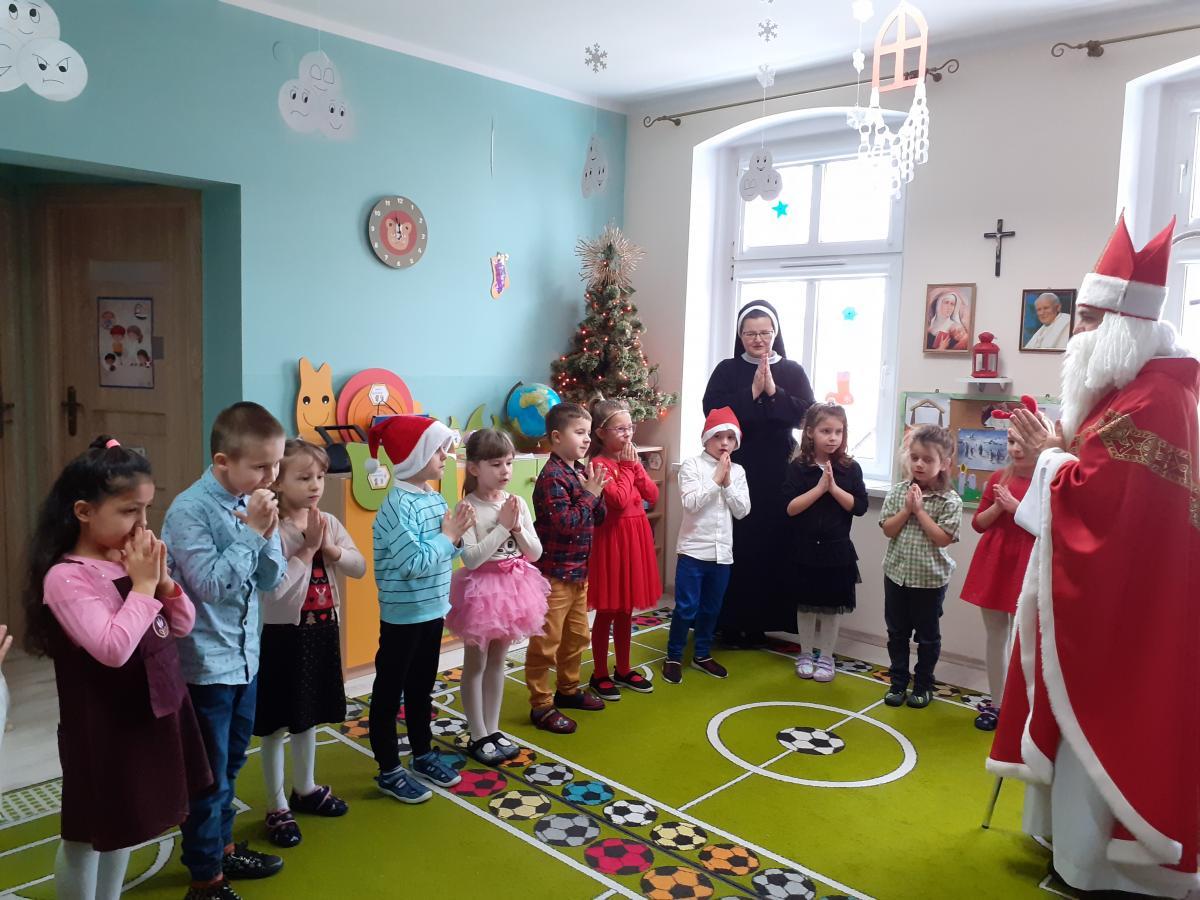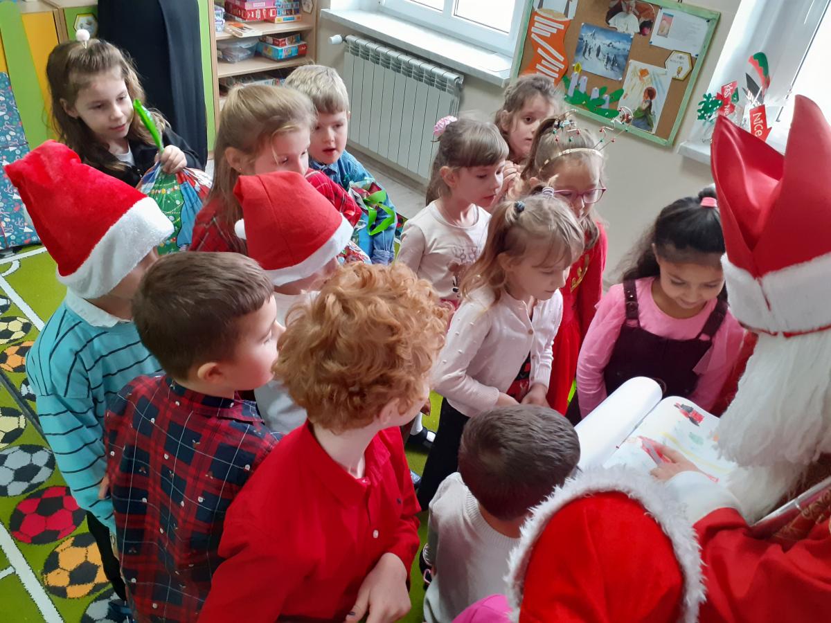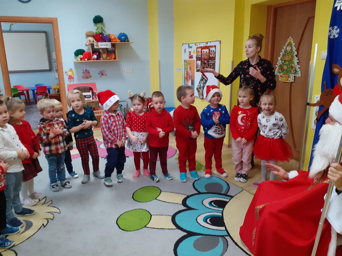Św. Mikołaj odwiedził po kolei wszystkie grupy. Był u „Słoneczek”, „Żabek”, „Sówek” i „Pszczółek”. Każda grupa witała Dostojnego Gościa piosenką, często ilustrowaną gestem lub tanecznym krokiem, a po otrzymaniu podarku wszyscy pamiętali o czarodziejskim słowie „dziękuję”.  Św. Mikołaj oprócz indywidualnych podarków zostawił dla każdej grupy osobny prezent, który dzieci wspólnie otwierały i zaraz wykorzystały do zabawy. Cały dzień pełen wrażeń, to opowiadanie, jak wyglądał święty i że uczy nas dobroci.