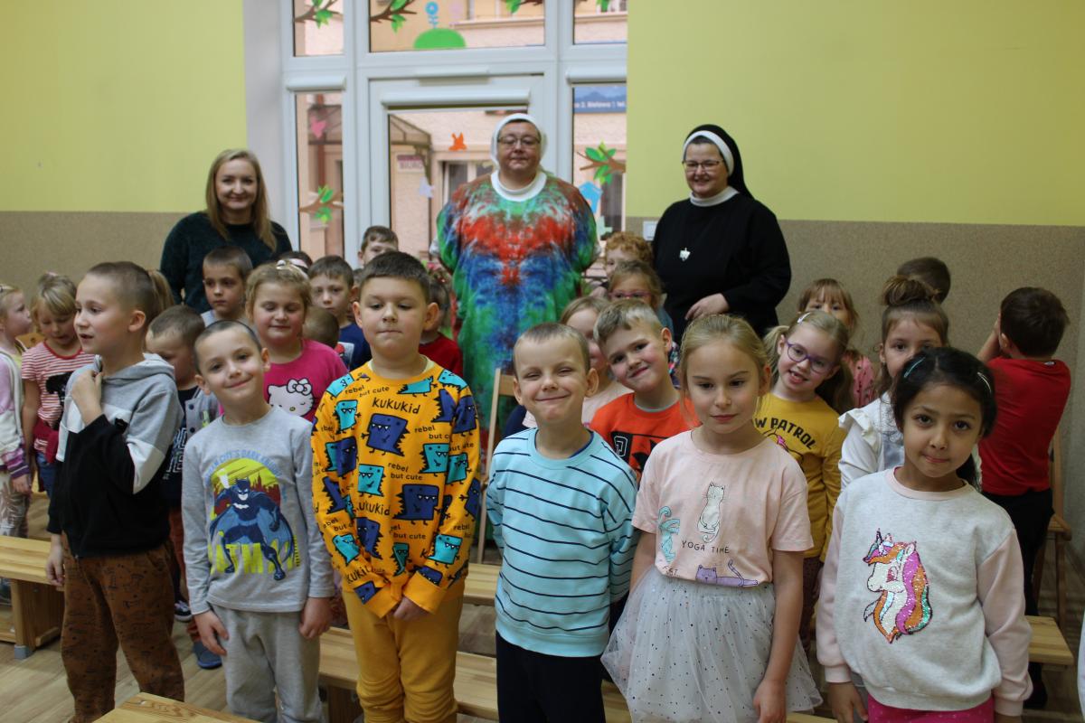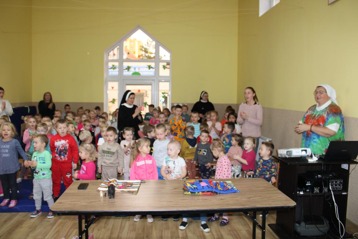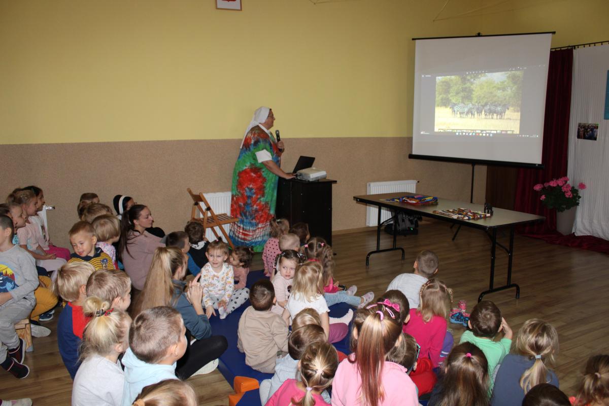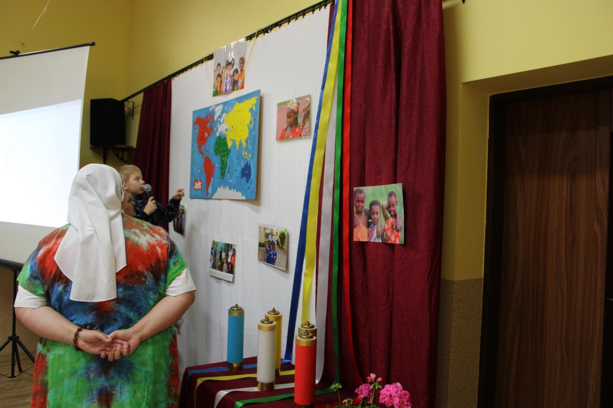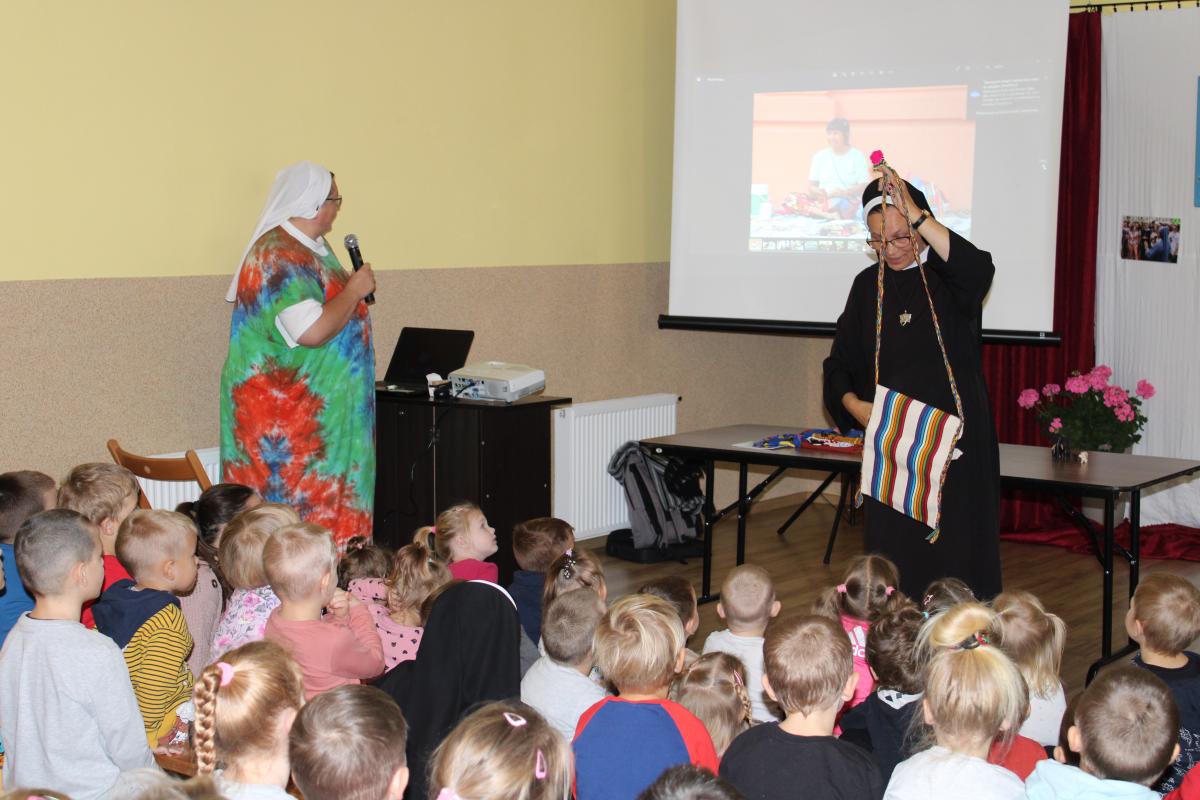 W poniedziałek mamusie naszych przedszkolaków przyniosły smakowite ciasta, które we wtorek zostały sprzedane. Także kwiaty doniczkowe wyhodowane w przedszkolu zasiliły misyjny fundusz. W środę gościła u na s. Ancilla Wiśniewska misjonarka posługująca w Afryce w Tanzanii i w Ameryce Południowej w Paragwaju. Siostra przywiozła trochę rekwizytów, kolorowych chust, zasłon używanych w tych egzotycznych krajach, sama przystroiła się w suknię z Tanzanii. Opowiadała o życiu ludzi tam mieszkających, ilustrując opowiadanie zdjęciami i filmikami, co jeszcze bardziej przyciągało uwagę dzieci. Kolejne dni tygodnia misyjnego to loteria fantowa. Dzieci wyciągały losy i wygrywały ciekawe upominki i gadżety. Tym wszystkim wydarzeniom towarzyszyła codzienna modlitwa w intencji misjonarzy na całym świecie.