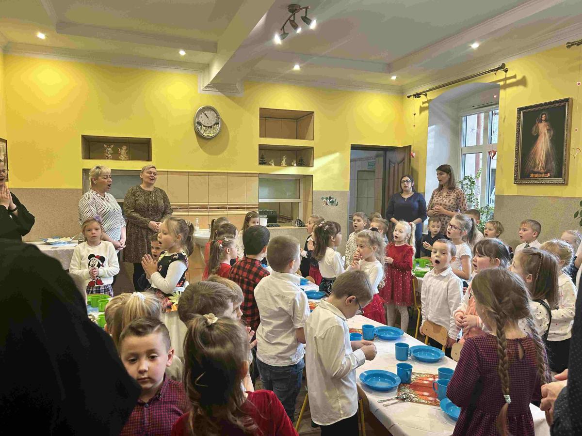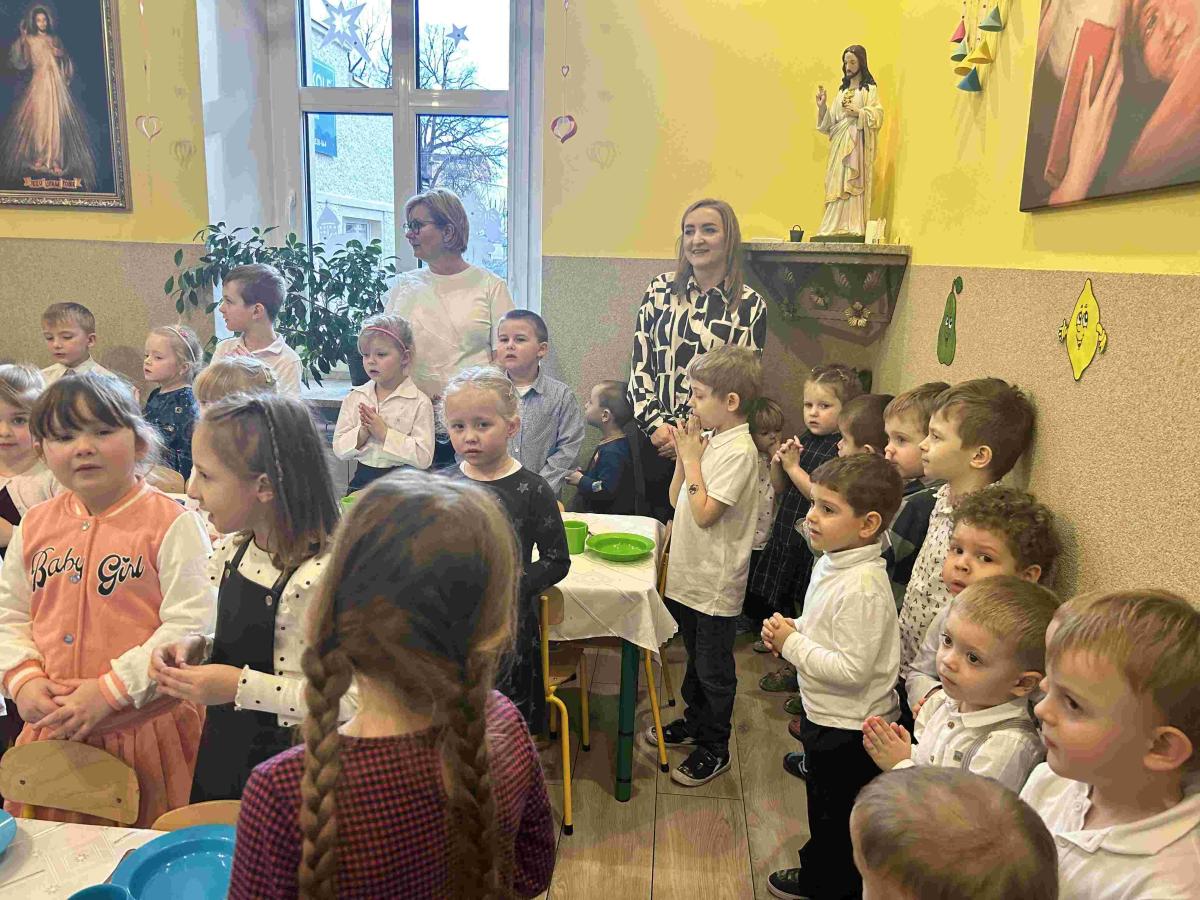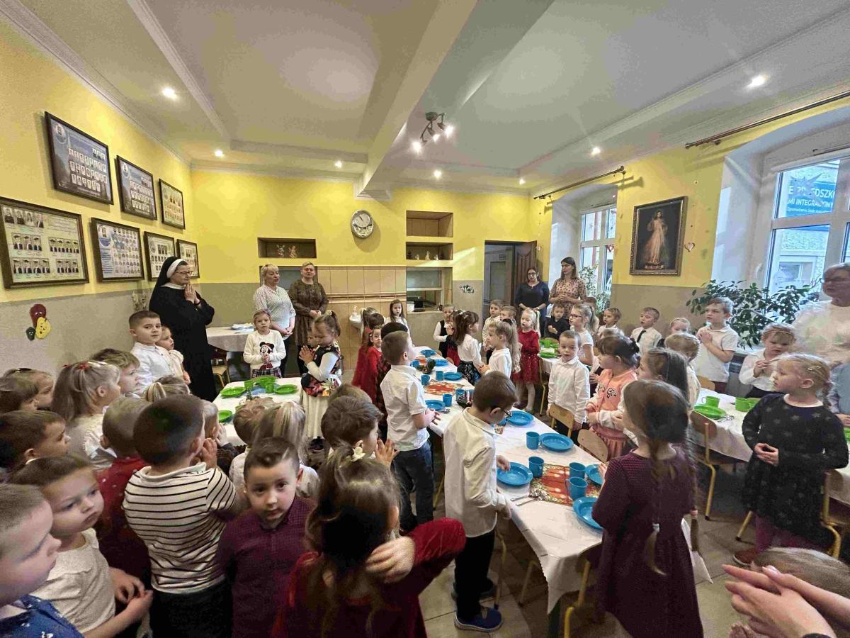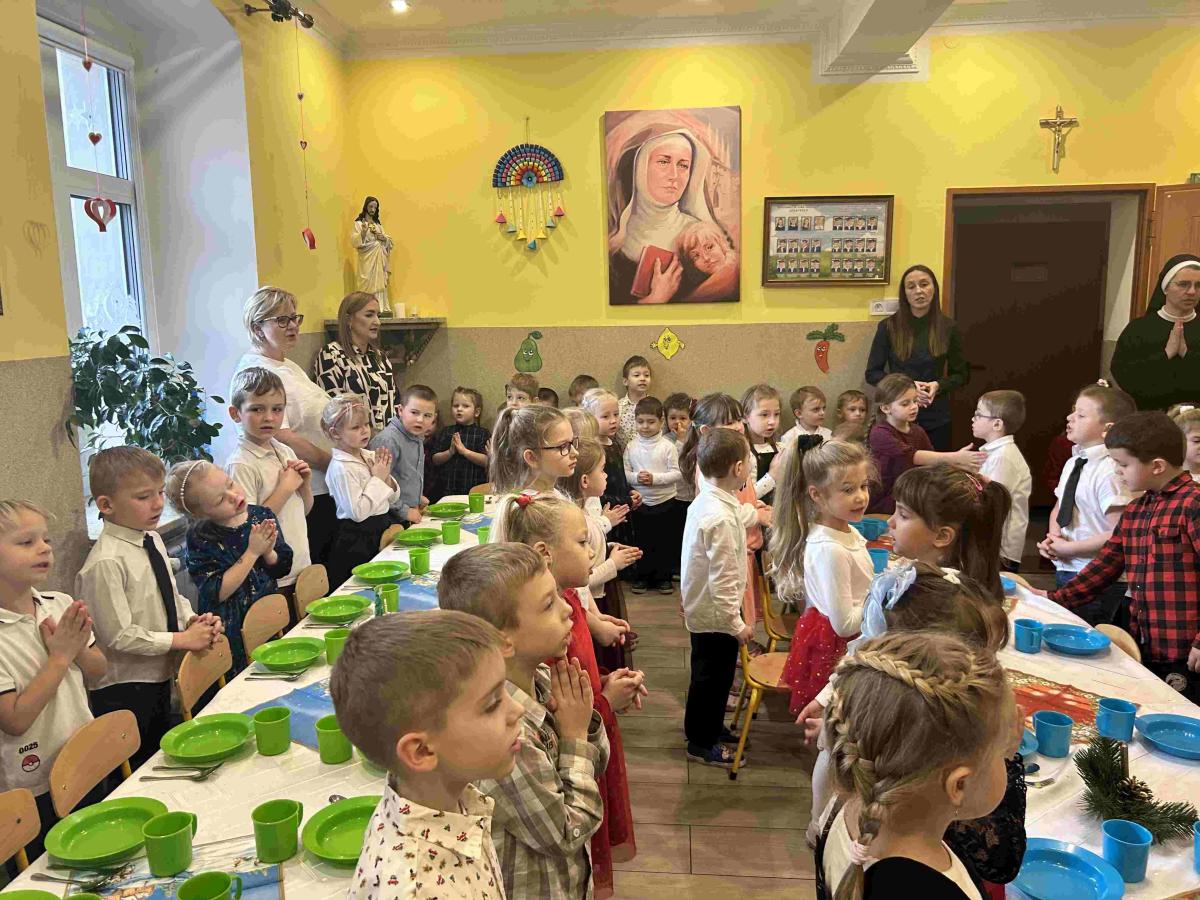 W dzień przedszkolnej wigilii panowała radosna, ożywiona atmosfera. Świąteczne dekoracje oraz dzieci w galowych strojach wprowadzały nastrój oczekiwania na wyjątkowe, niecodzienne wydarzenie. Uroczystość rozpoczęły wspólne kolędowanie i wysłuchanie fragmentu z ewangelii św. Łukasza o narodzeniu Jezusa. Na stole pojawiła się tradycyjna ryba oraz inne świąteczne przysmaki. Czas upłynął w bardzo miłej, serdecznej atmosferze. Wszystkie dzieci czuły zbliżające się wielkimi krokami Święta Bożego Narodzenia.