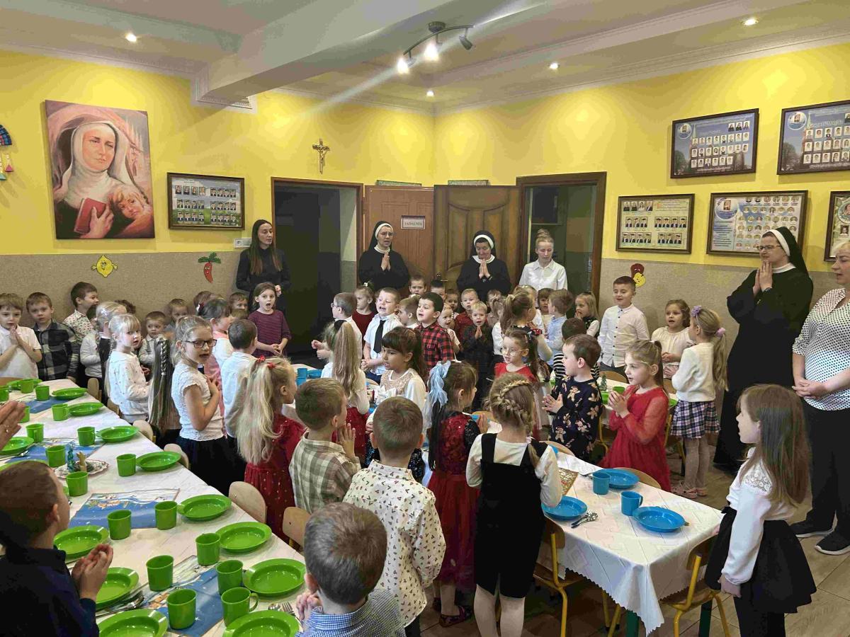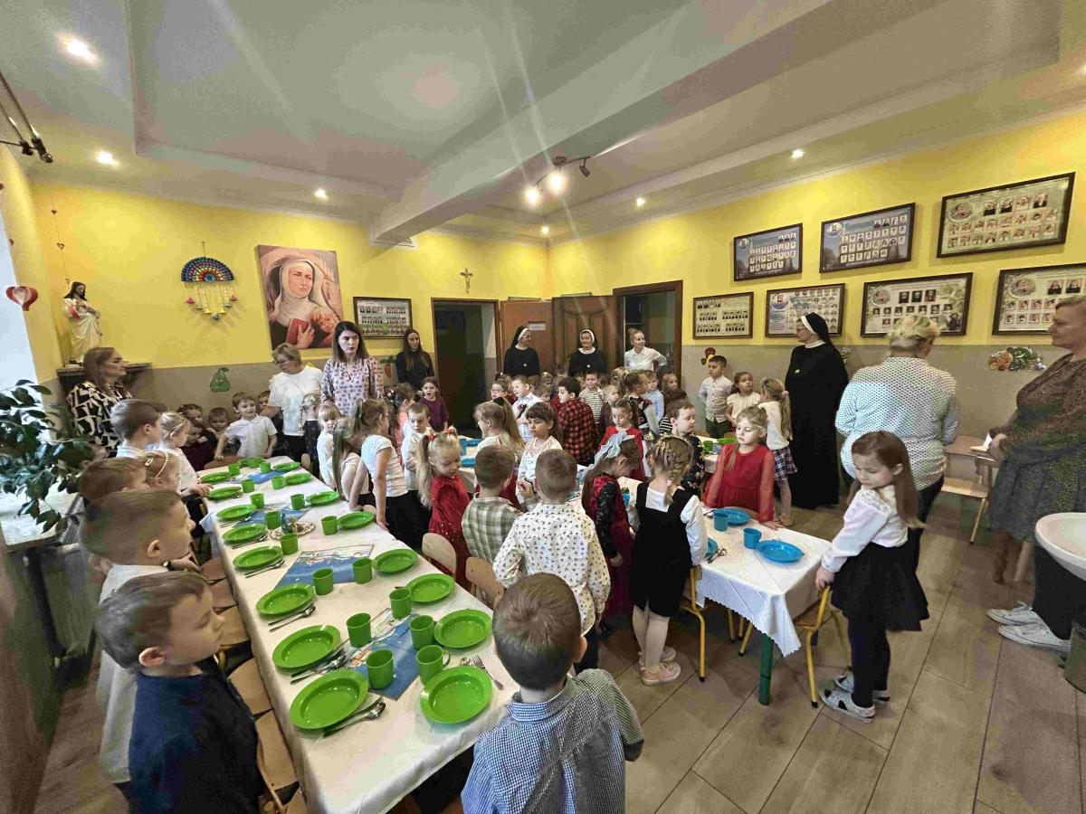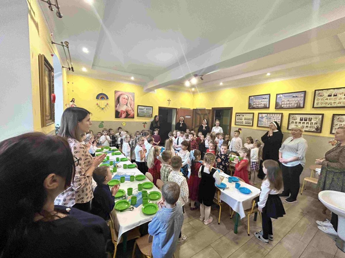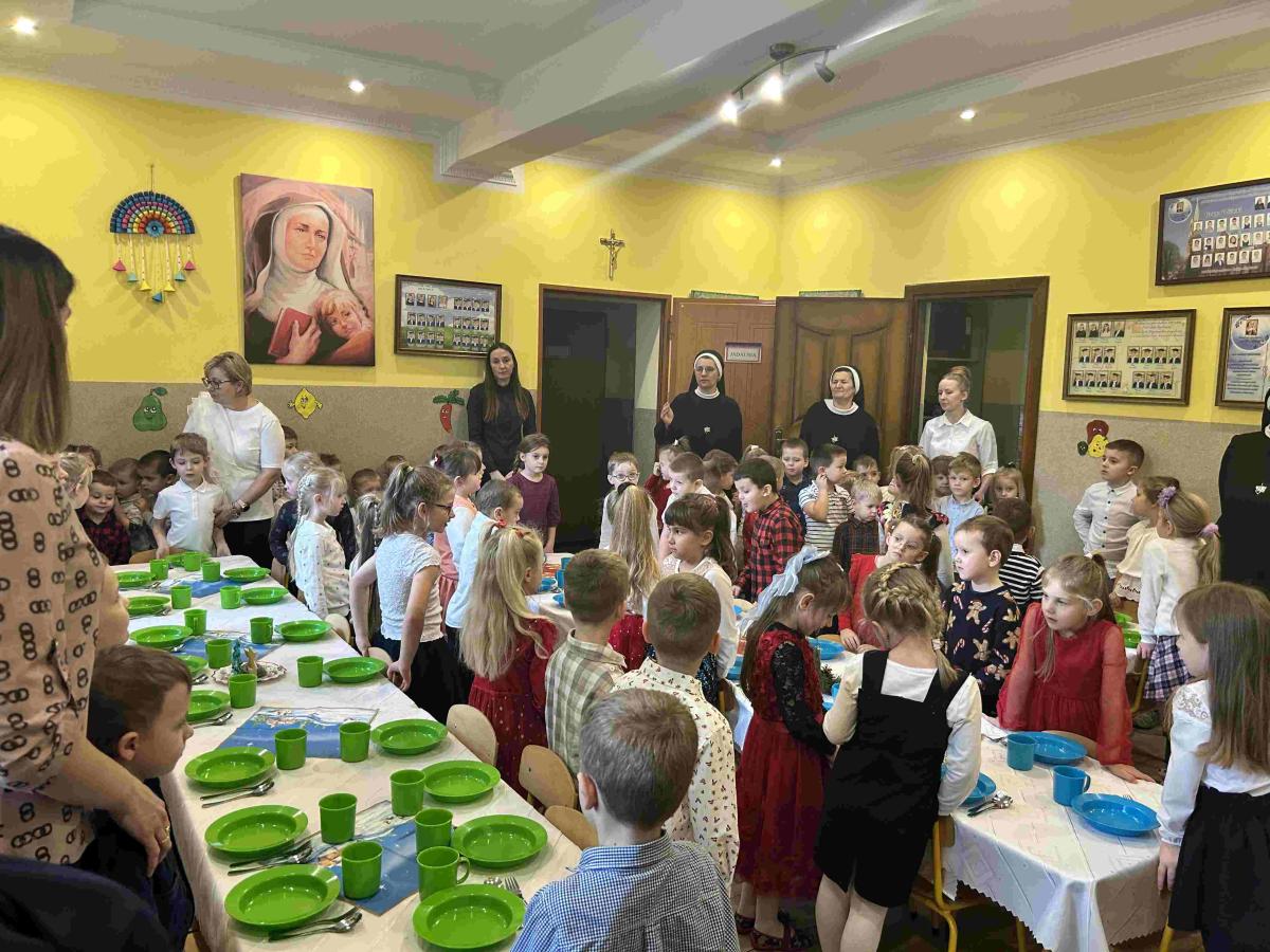W dzień przedszkolnej wigilii panowała radosna, ożywiona atmosfera. Świąteczne dekoracje oraz dzieci w galowych strojach wprowadzały nastrój oczekiwania na wyjątkowe, niecodzienne wydarzenie. Uroczystość rozpoczęły wspólne kolędowanie i wysłuchanie fragmentu z ewangelii św. Łukasza o narodzeniu Jezusa. Na stole pojawiła się tradycyjna ryba oraz inne świąteczne przysmaki. Czas upłynął w bardzo miłej, serdecznej atmosferze. Wszystkie dzieci czuły zbliżające się wielkimi krokami Święta Bożego Narodzenia.